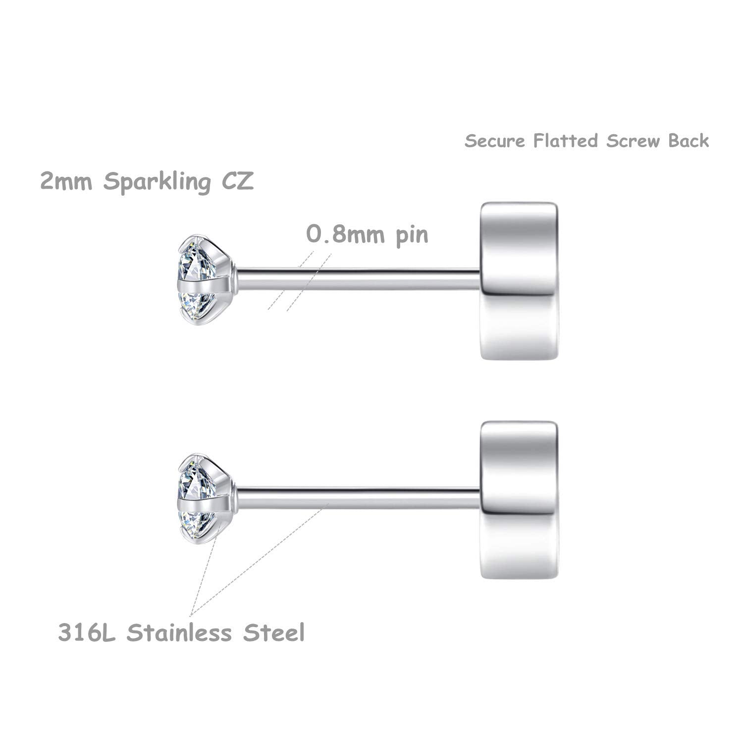 - Small Stud Earrings Style-----8 Pairs 2mm small stud earrings with screw back of the same size included in one order. These minimalist flat back stud earrings can be used as nice nap or daily earrings for women and men, paired well with any casual or formal outfit. CZ Diameter: 2/3/4mm for choice, Bar Length: 6mm. Flat Back Diameter: 4mm. Gague Size: 0.8mm=20G.