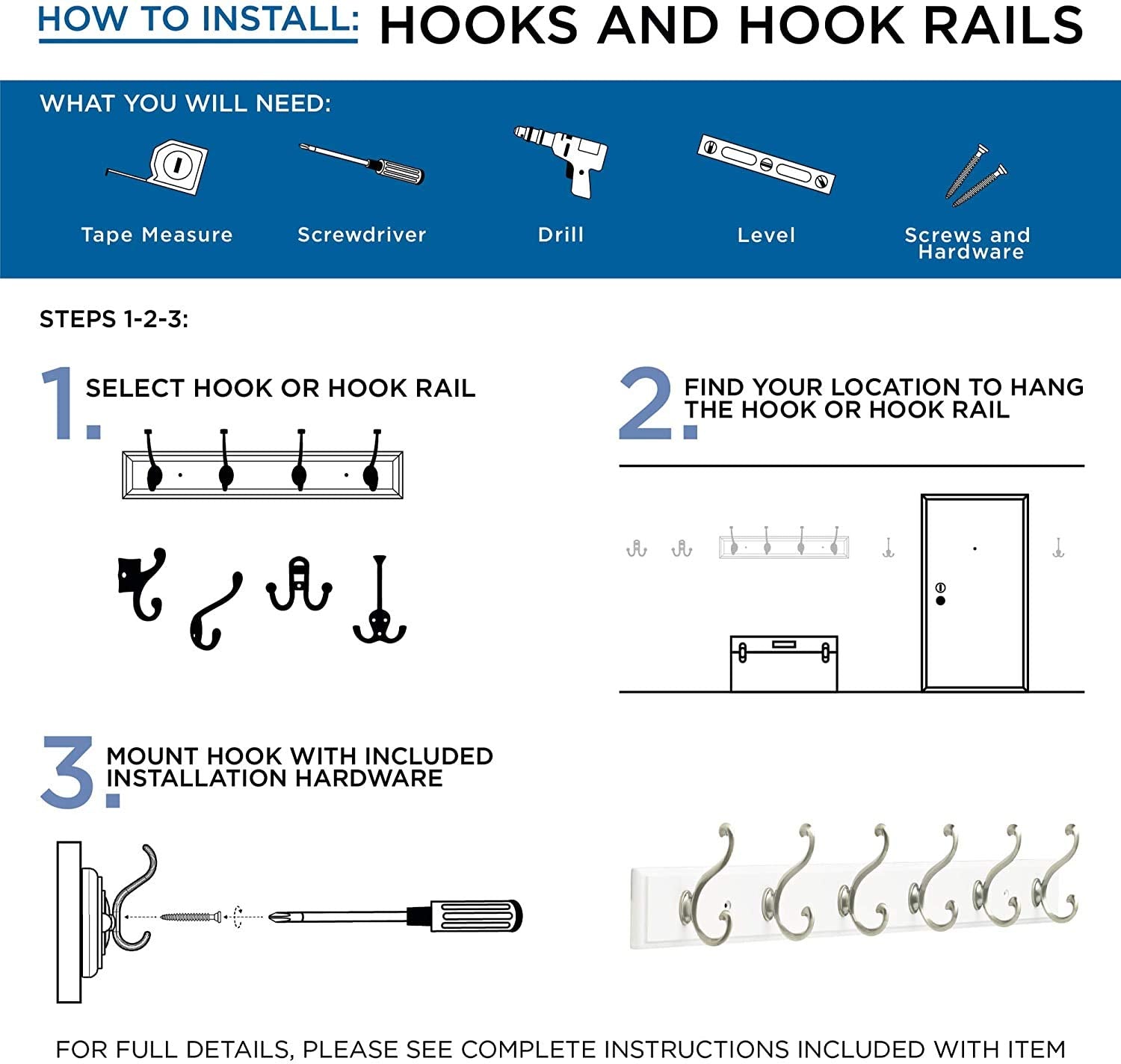 | included components | Installation Sheet for Standard Individual Hook^#6 X 1 Phillips Oval Head Tapping Screw^Single Prong Robe Hook, Premium Grade |