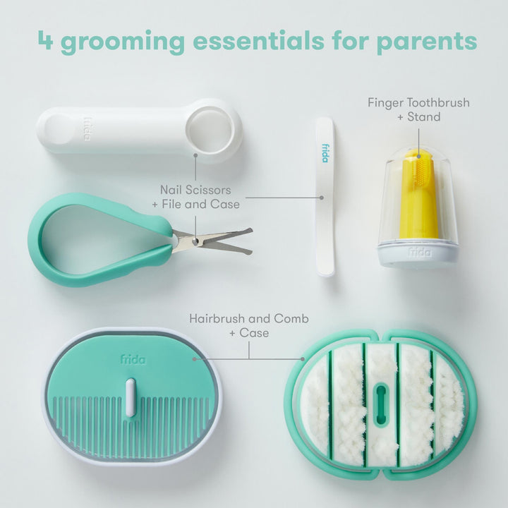 - Original Grooming & Healthcare Kits – Grooming Kit, Baby Essentials Gift Set Includes Finger Brush with Storage Stand, Hair Brush with Case, Styling Hair Comb, Easy Grip Nail Scissors with Nail File and Case by Frida Baby