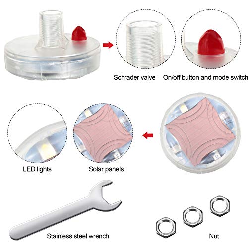 - Easy to install: the car solar tire wheel lights is convenient to assemble, you just simply use the wrench to screw onto the car wheel air valve to complete the installation, the tire lights is compatible for the vehicle which is equipped with America tire valves, such as bicycles, motorcycles, cars, SUV and truck. You can turn on/off the light by pressing for a while