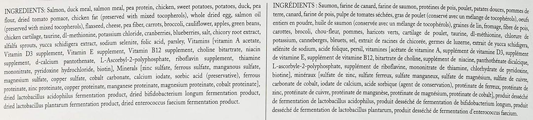 | ingredients | Salmon, Duck Meal, Salmon Meal, Pea Protein, Chicken, Sweet Potatoes, Potatoes, Duck, Pea Flour, Dried Tomato Pomace, Chicken Fat, Dried Whole Egg, Salmon Oil, Flaxseed, Cheese, Pea Fiber, Carrots, Broccoli, Cauliflower, Apples, Green Beans, Chicken Cartilage, Taurine, DL-Methionine, Potassium Chloride, Cranberries, Blueberries, Salt, Chicory Root Extract, Alfalfa Sprouts, Yucca Schidigera Extract, Sodium Selenite, Folic Acid, Parsley, Sorbic Acid (Preservative), Vitamins, Minerals, Probiotics. |