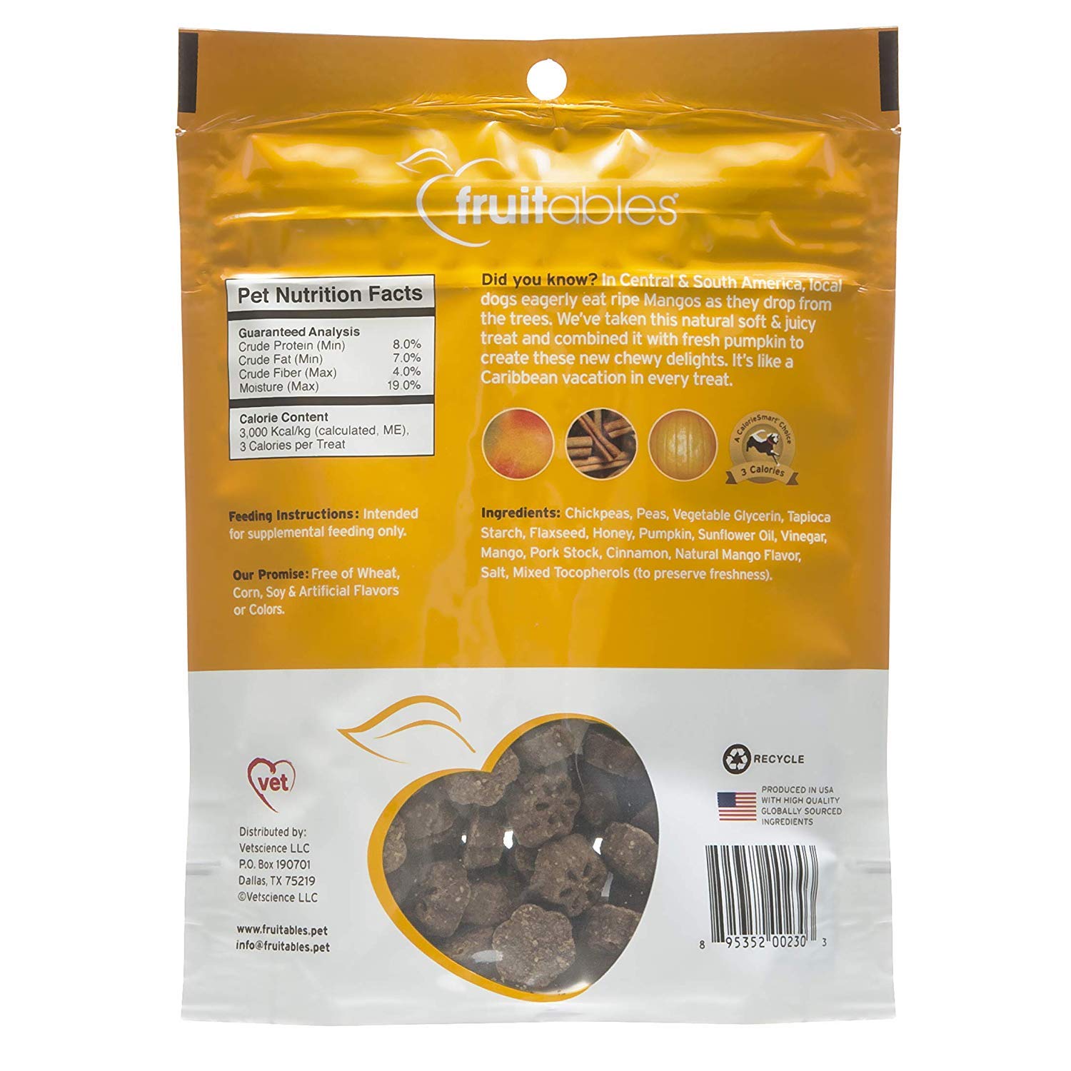 | ingredients | Pumpkin, Vegetable Glycerin, Chickpeas, Peas, Tapioca Starch, Honey, Flaxseed, Sunflower Oil, Citric Acid (to preserve freshness), Mango, Vinegar, Pork Stock, Natural Mango Flavor, Cinnamon, Salt, Mixed Tocopherols (to preserve freshness), Rosemary Extract, Green Tea Extract, Spearmint. |