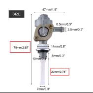 Keenso-- This fuel tank switch is specially designed for controlling the oil situation and maintaining the vehicle. ON/OFF 90 degree rotation; Hex Nut: 14mm / 0.6in; Thread Size: 10 × 1.25mm / 0.4 × 0.049in; Outlet Port: 1/4 hose barb. Fit for most brands of generator and engine tanks switches