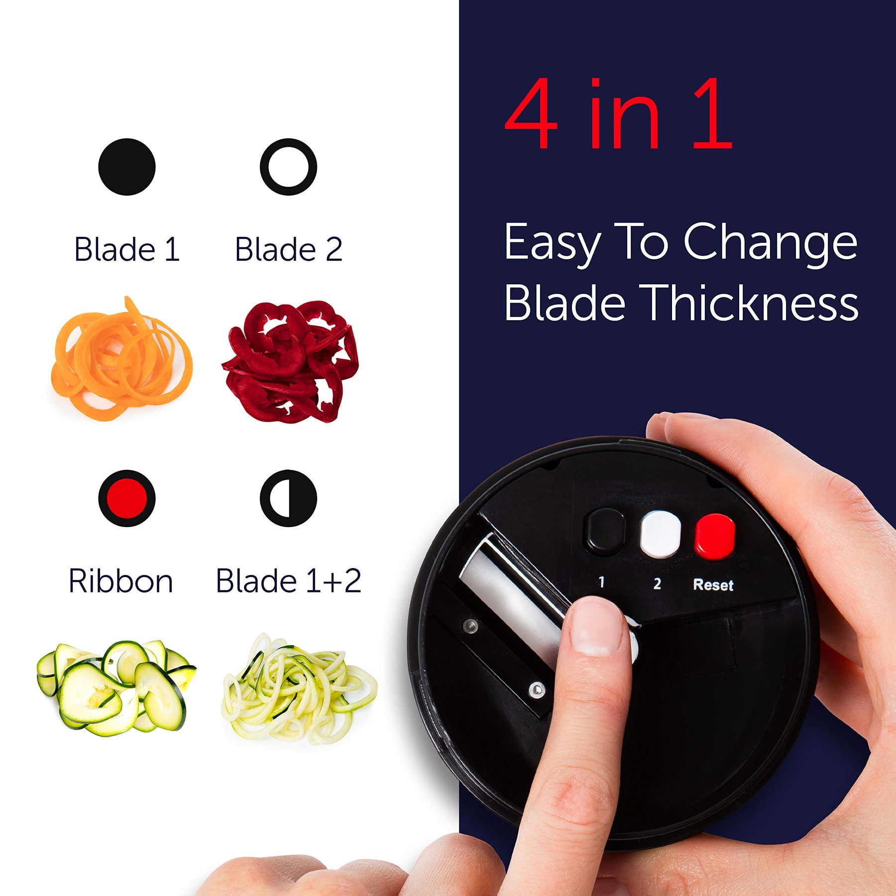 - Functionality with ease - 4 options to fulfil all of your spiralizing needs in 1 space-saving kitchen gadget. Perfect for zoodles, healthy vegetable pastas and gorgeous garnishes and all available with just an easy push of a button.