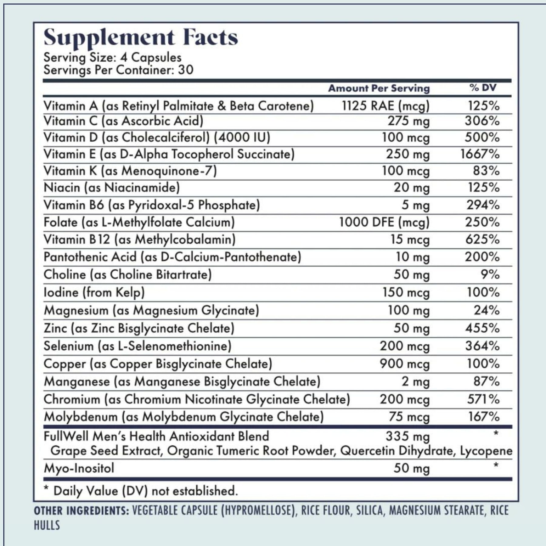 | product benefit | FullWell Men's Multivitamin delivers optimal, evidence-based forms and doses of nutrients in one potent yet easy-to-tolerate formula. You'll find fertility non-negotiables like methylated folate and B12, and chelated minerals in active, bioavailable forms, plus our exclusive antioxidant blend to support healthy sperm. |