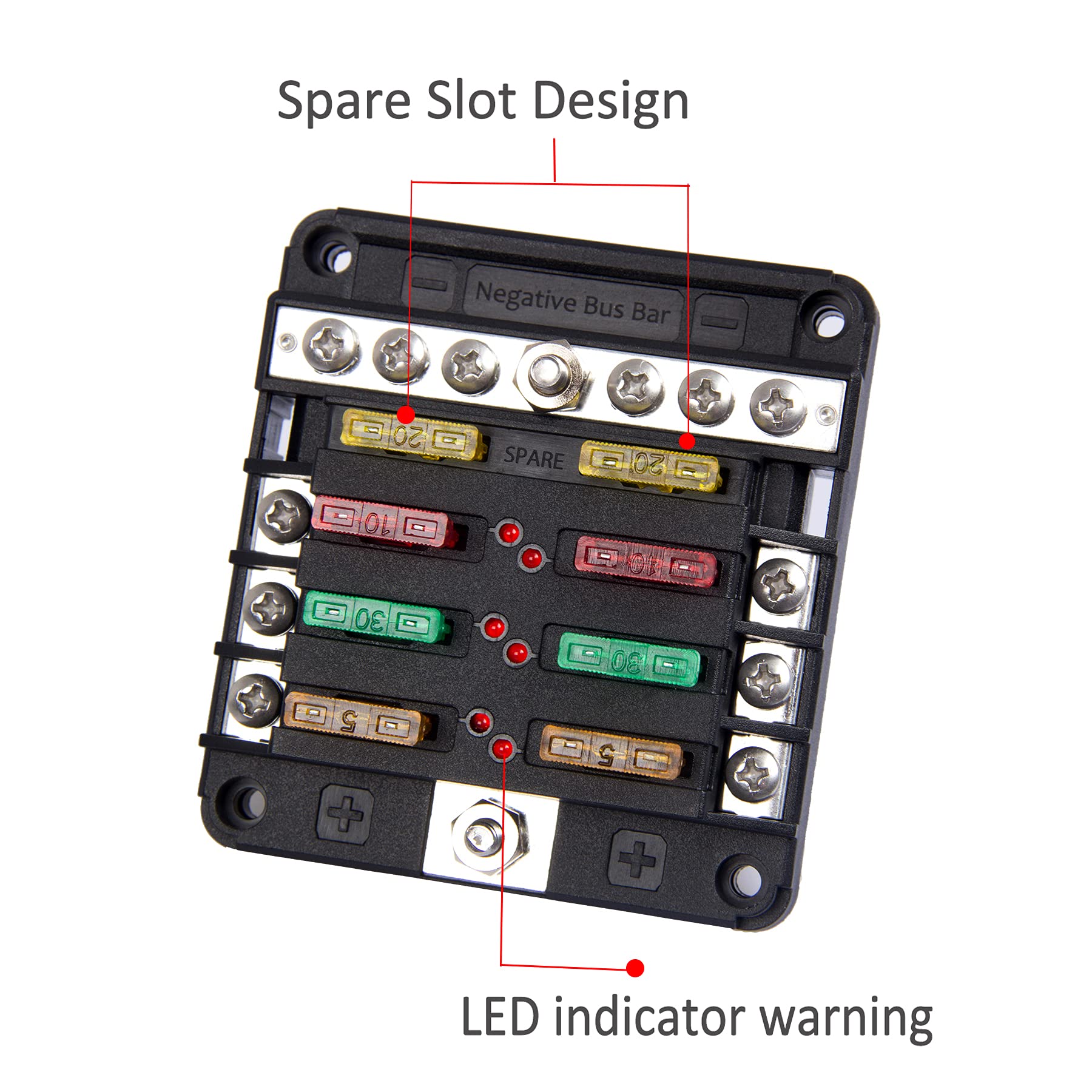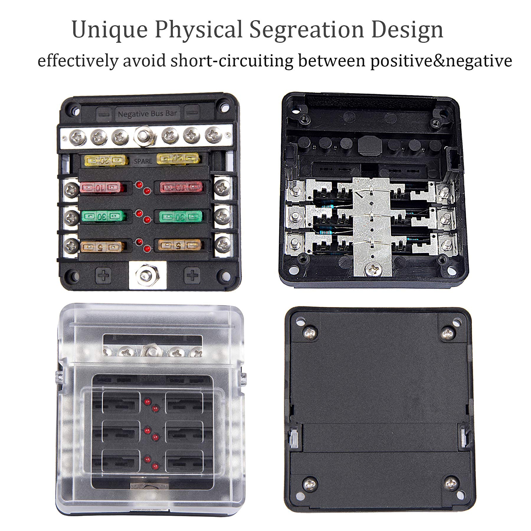 - Original Fuse Boxes – Fuse Block, 6 Way Fuse Panel with 36pcs Fuse Blades Fuse Box w/Negative Bus LED Warning Indicator for Boat Marine Car Auto (6 Circuit) by DOCAS