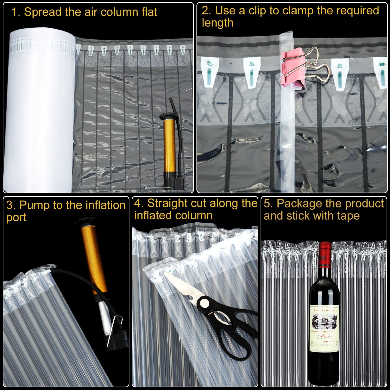 - Steps for Usage: 1. Spread the air column flat; 2. Use a clip to clamp the required length; 3. pump to the inflation port; 4. Straight cut along the inflated column; 5. Package the product and stick with tape