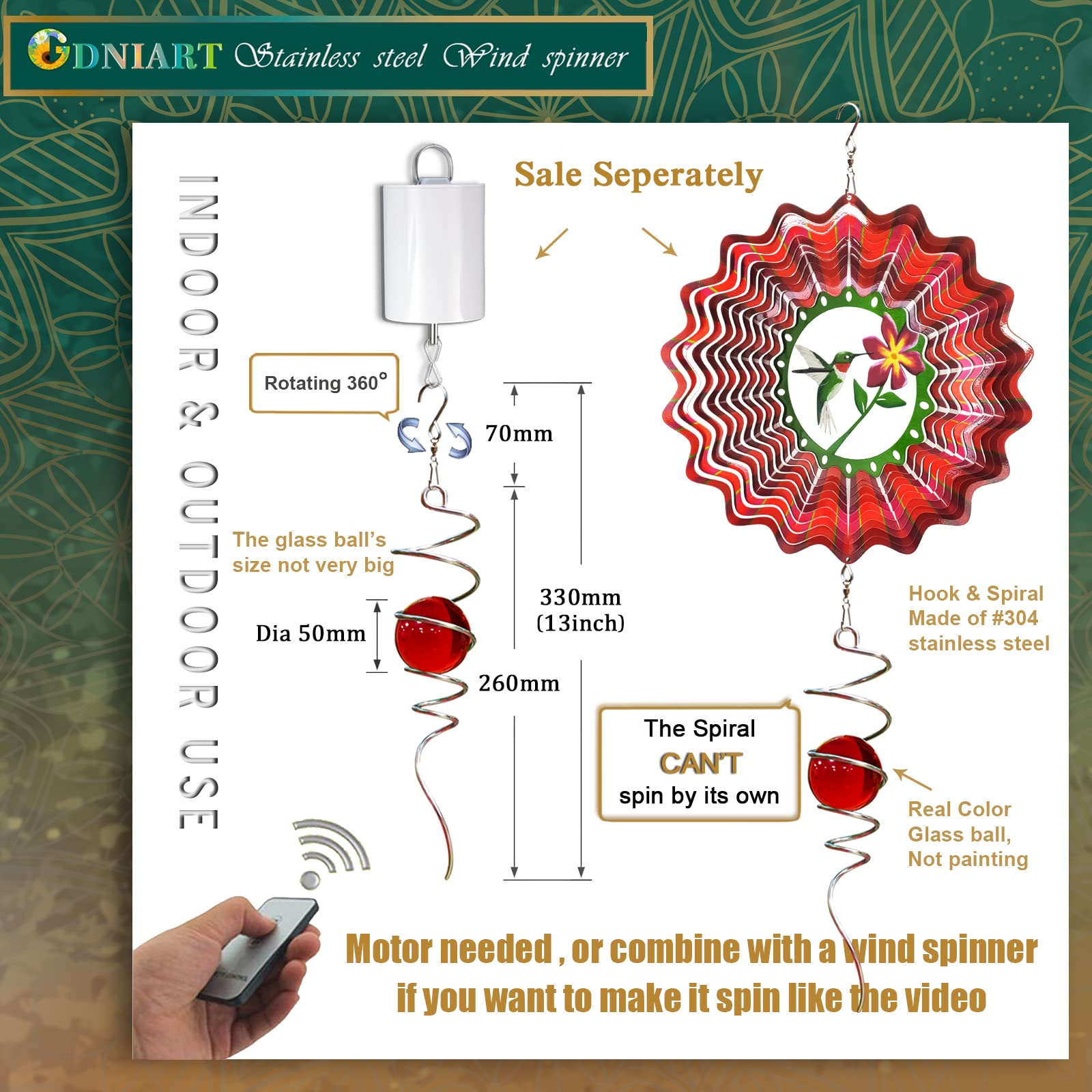 - WIDE RANGE OF HOME DÉCORWind spinners can hang on trees, wall, balcony, porch,window, garden, yard and any other occasion. Add a power operated motor (NOT INCLUDE) can help your spinner rotate as constant speed as the video show.combine with 1pc gazing ball spiral tail as a stabilizer will help your garden spinner to spin smoothly instead of wiggle when big windy weather,and can get further decoration