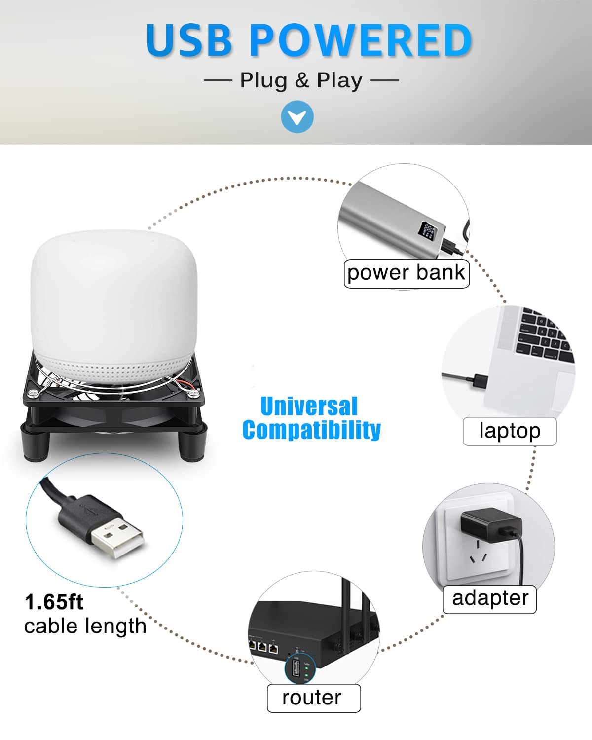 Perfect fit for cooling Routers, Modems, TV box, Receivers, 5G Home Internet Gateway, Intel NUC, Super console x pro, Mac mini, raspberry pi, SSD and other audio-video equipment, or other poorly ventilated areas.