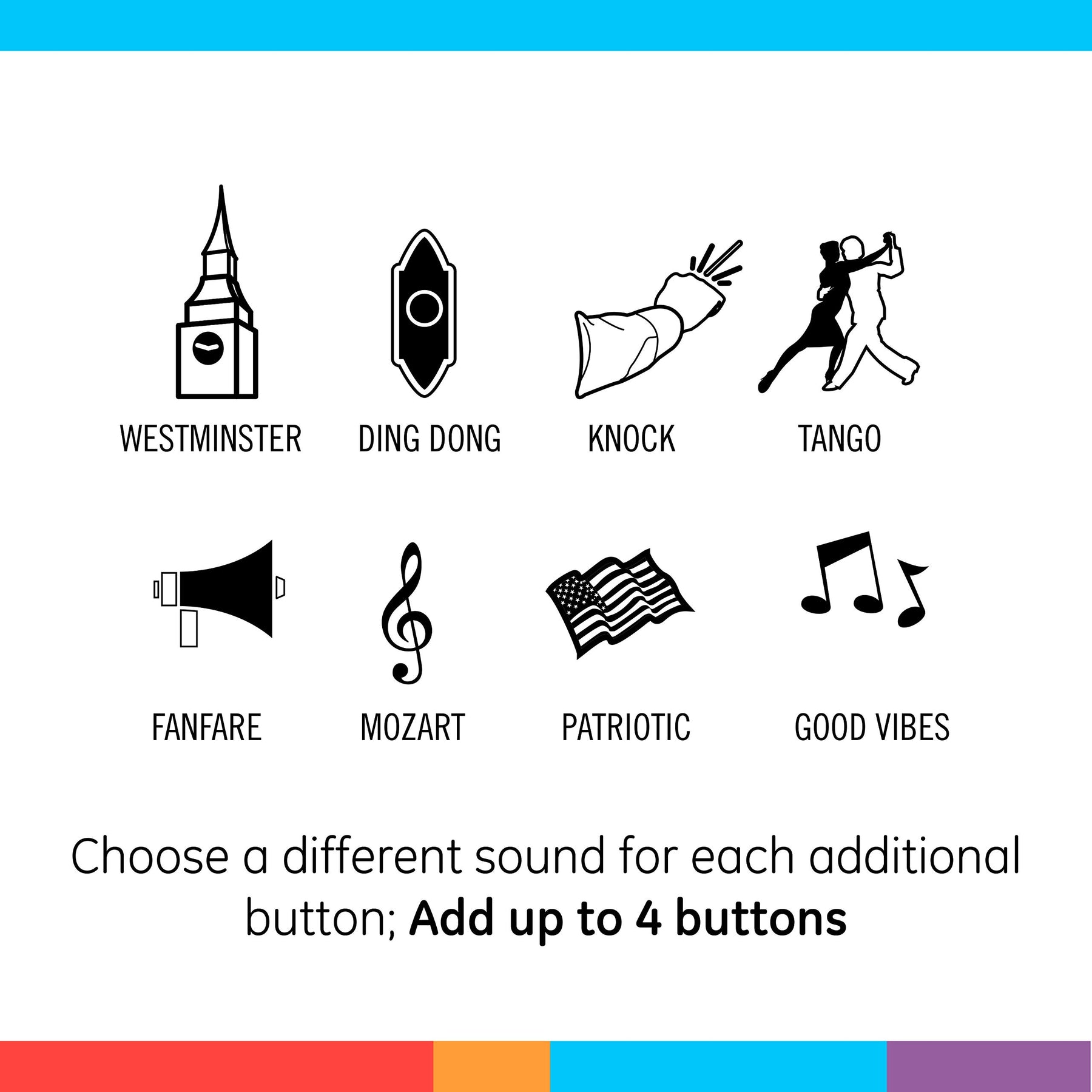 - Melody Selection – Choose from 4 different volume options and 8 different melodies, including ding dong, fanfare, good vibes, knocks, Mozart, patriotic, tango and Westminster.