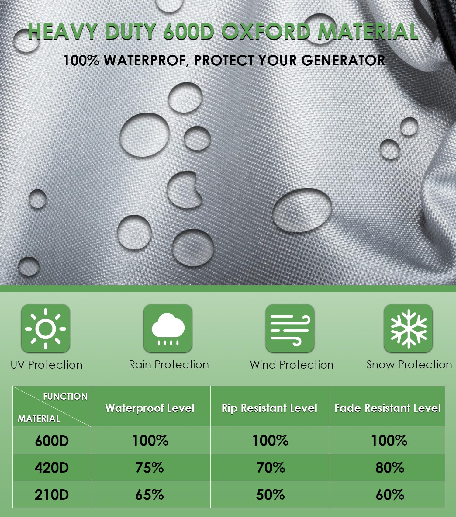 - ?SUPERIOR MATERIAL? Made of heavy duty material 600D durable polyester fabric with an added advanced water-resistant PVC coating. This generator cover will keep your generator safe from rain, snow, dust, dirt and UV rays. Foldable, easy to carry and store.