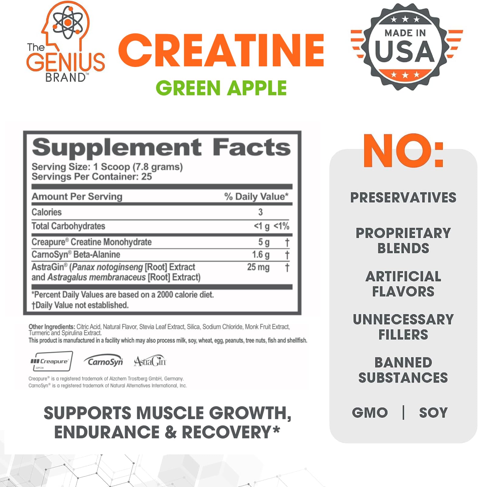 - Post-Workout Muscle Maximizer: Genius Creatine by The Genius Brand acts fast to recharge every cell and build muscle faster.* Each serving provides 5 g of German Creapure, an elite creatine monohydrate source, along with premium CarnoSyn Beta-Alanine to boost muscle function and performance and AstraGin for superior bioavailabilty.* Green Apple flavor. 25 scoops per container.
