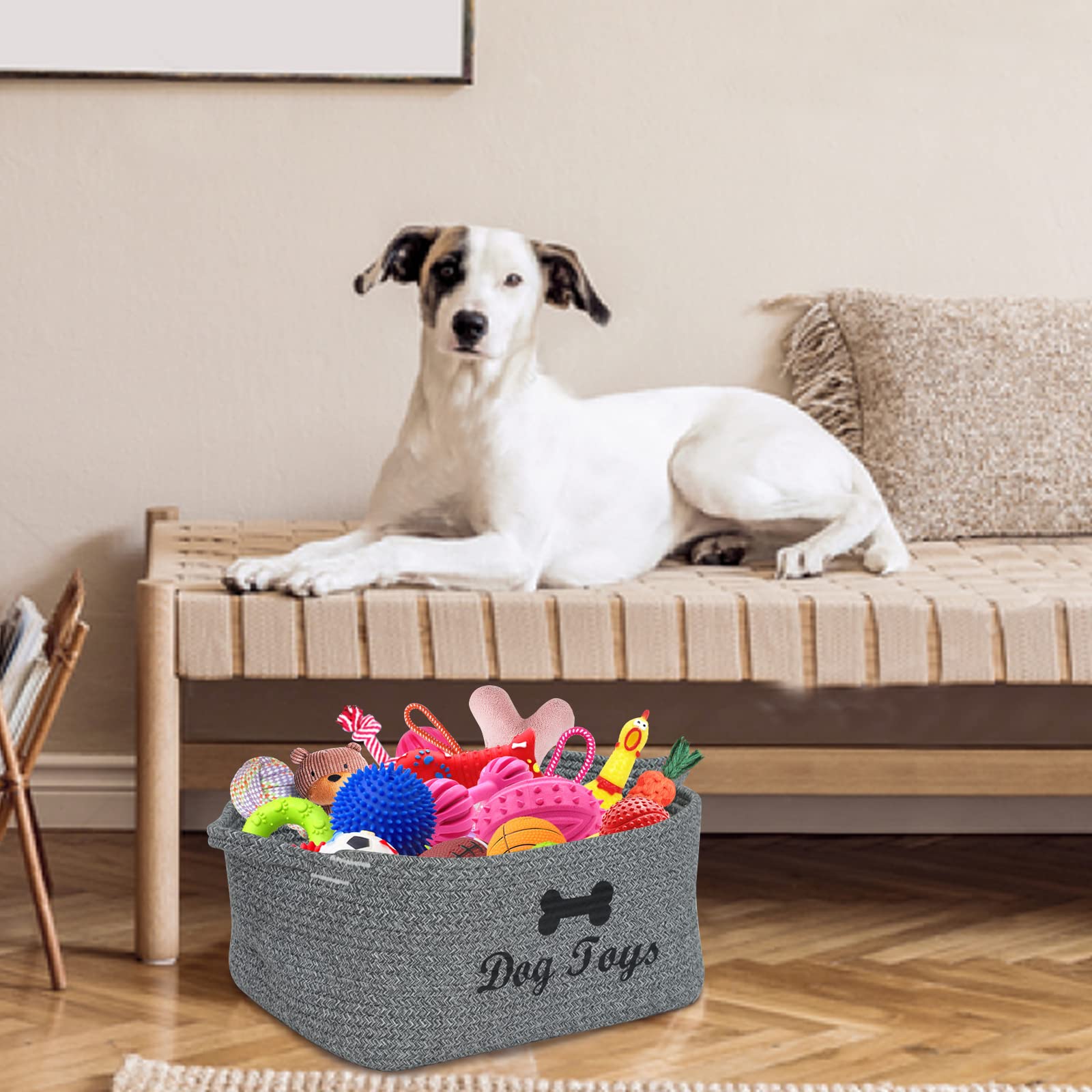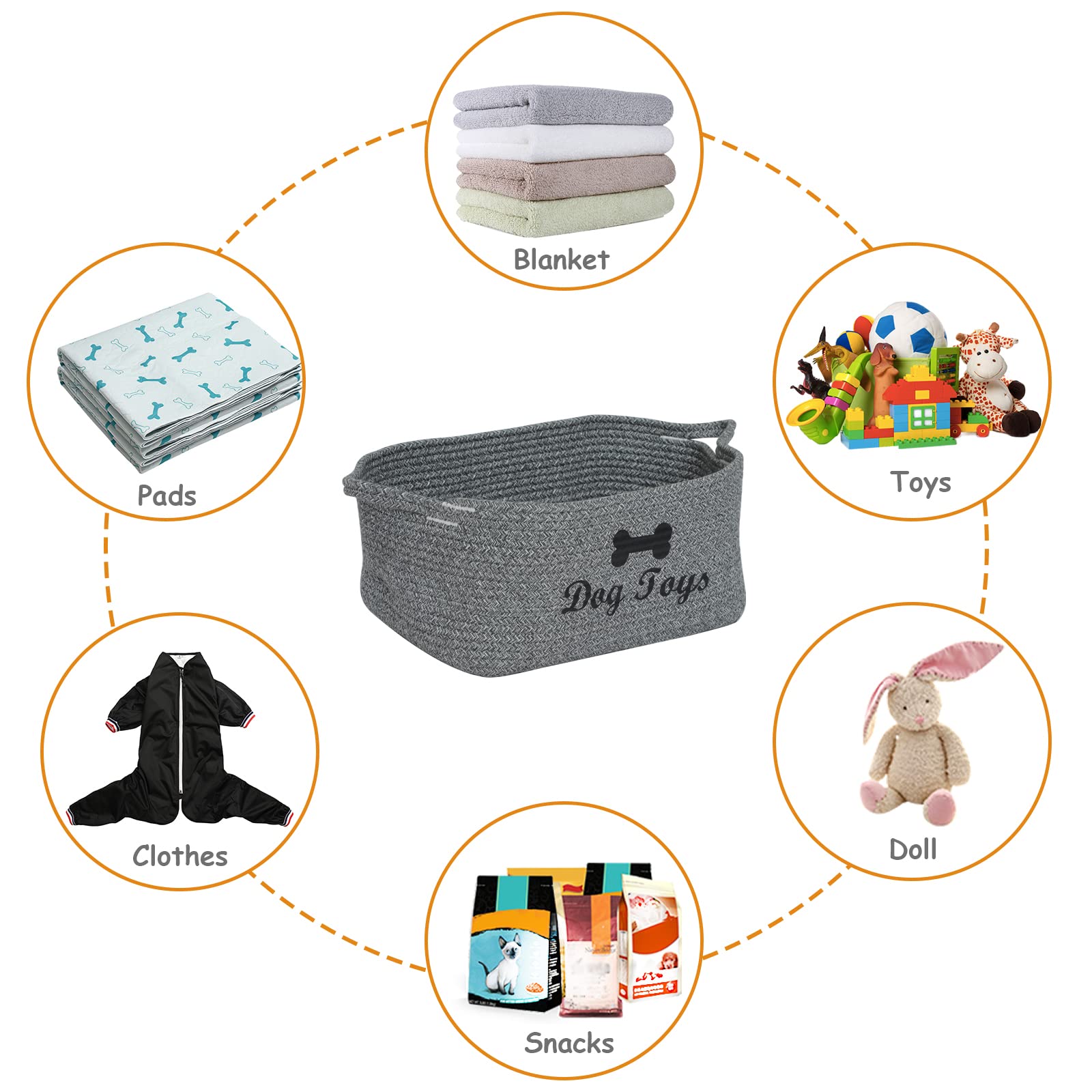 - 1.The rope toy baskets perfectly keep your dog's article organized. The basket double as the storage for your bedrooms,bathrooms, living room, closets, shelves or anywhere indoor.