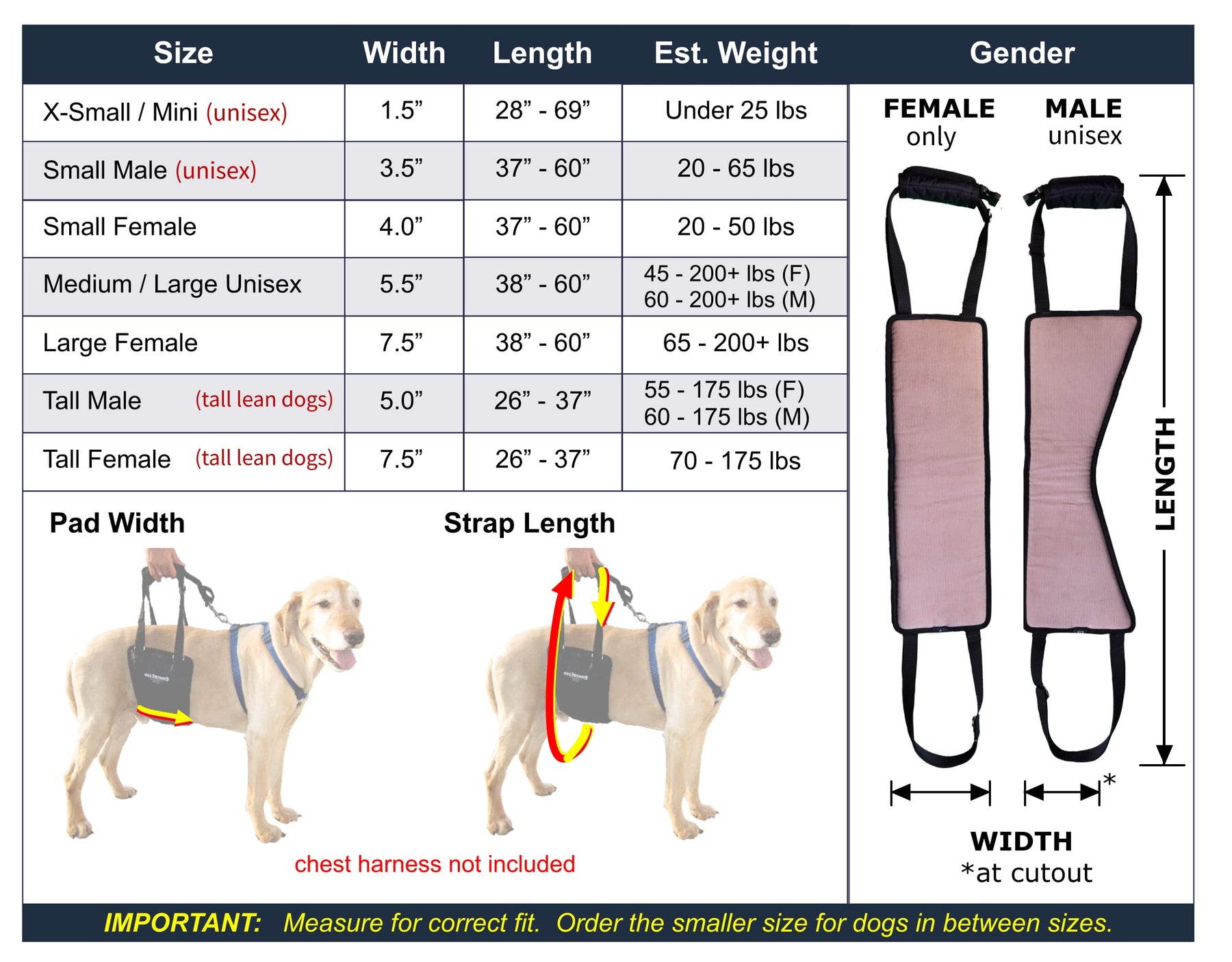 - SIZING - Typically fits FEMALE dogs over 45 lbs and MALE dogs over 60 lbs. Support pad is 5.5 wide (at the cutout) x 22.5 long. Sling length adjusts from 38 - 60 long. Please measure to ensure the proper fit. The cutout in the support pad accommodates most large to giant breed male dogs as well as medium to large size female dogs.
