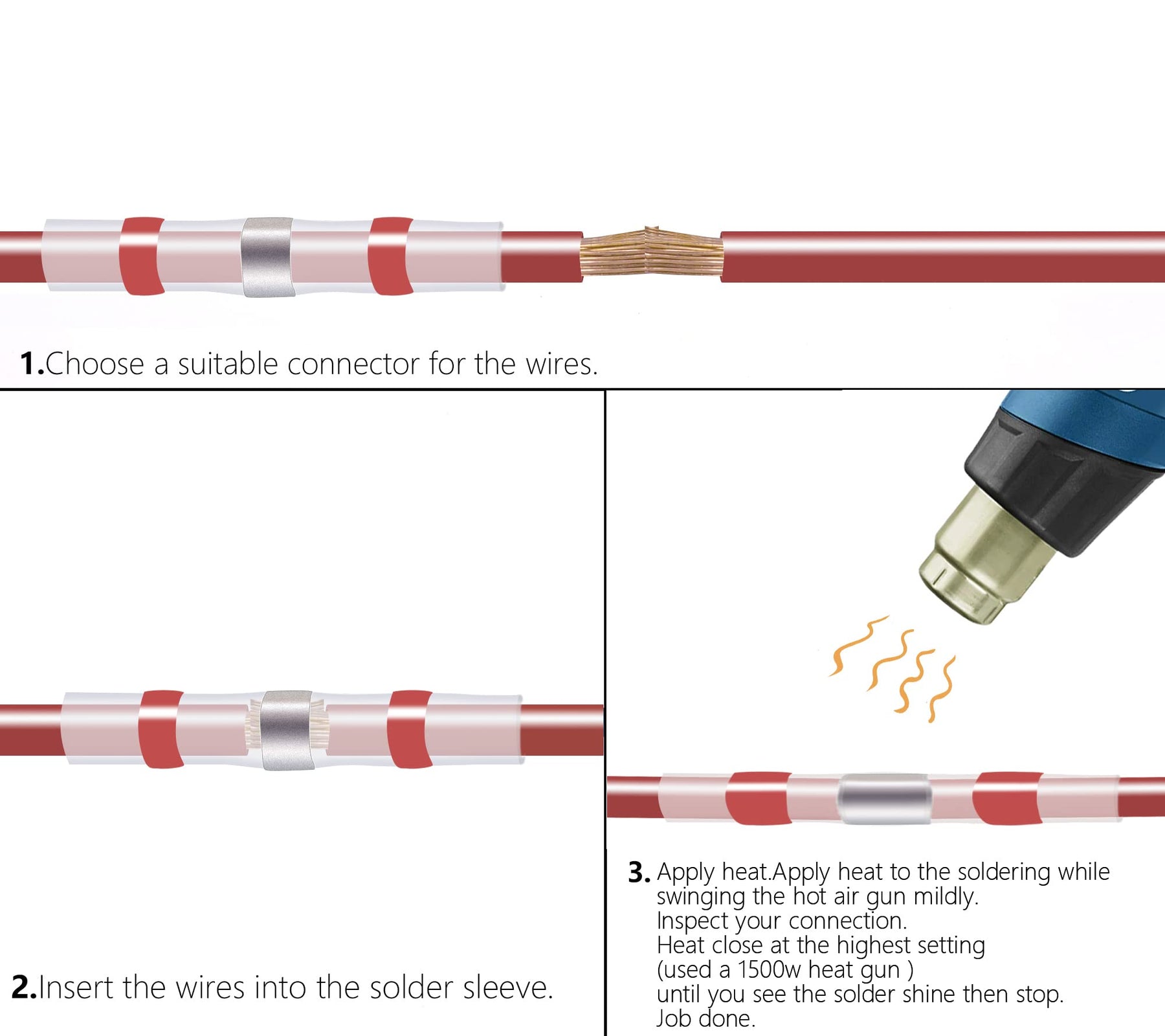 - No need to crimp, just one step connection, easy to use. DO NOT use a lighter or fire to apply heat.