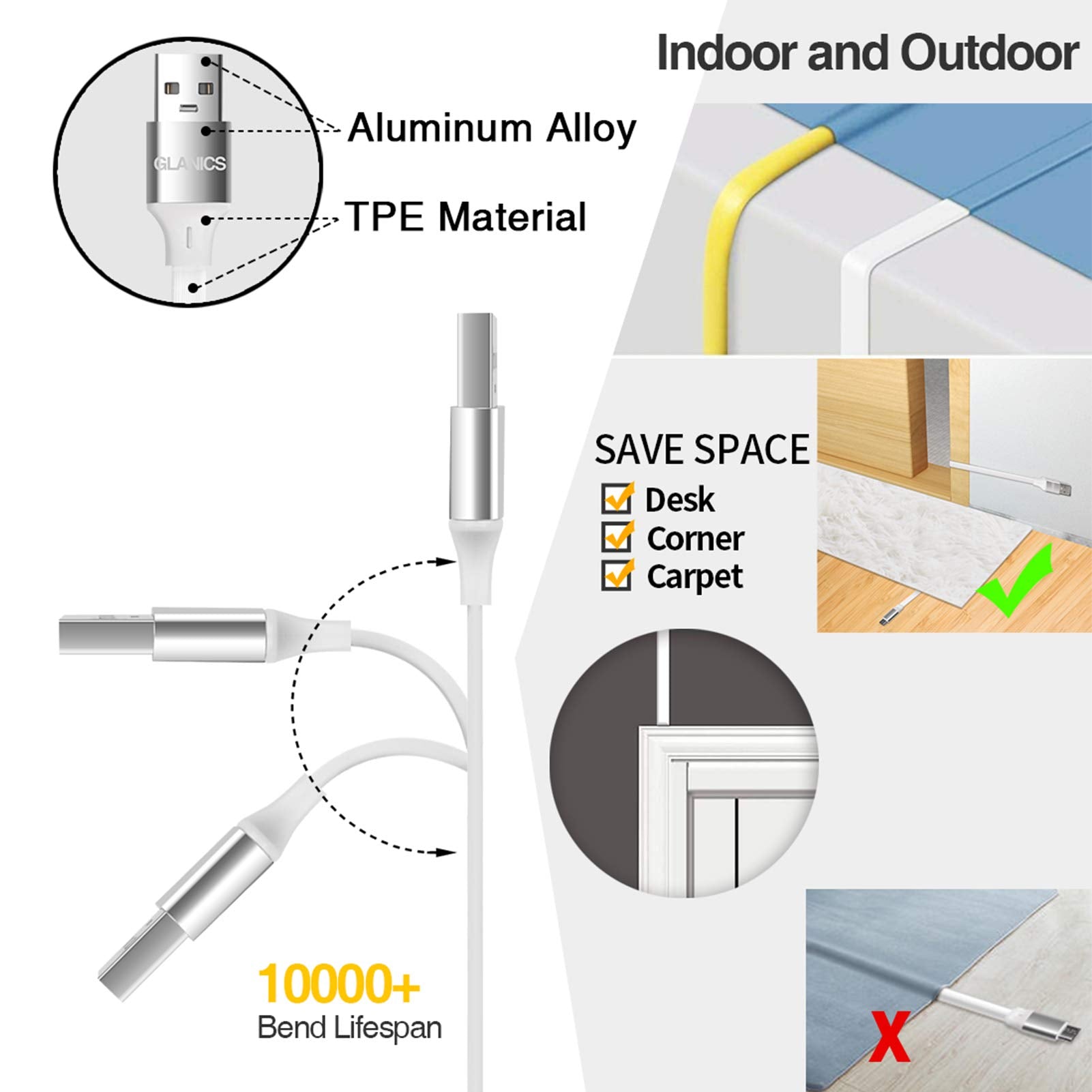 - Long Micro USB Cable - 20 ft flat cable is long enough, easy for home and office wiring, taking into Carpets and walls, indoor and outdoor. The Micro USB cord is also tangle free and flexible, can be bent 10000+ times, still sturdy and strong.