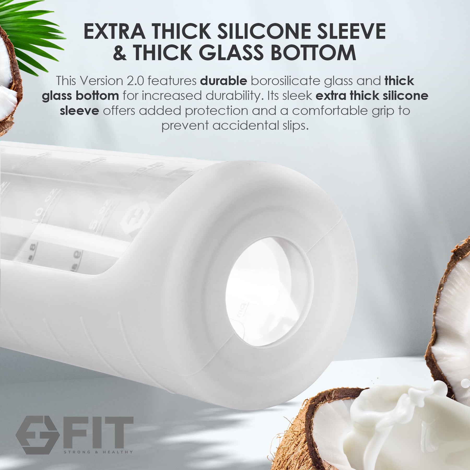 - Water Bottle and Cleaning Brush Set: Upgrade your hydration routine with our 32 oz Glass Water Bottle with Time Marker and Cleaning Brush Set; this version features an extra thick silicone sleeve for extra protection, insulation, and a secure grip; we've also upgraded one of the lids to a straw lid for sipping on the go; the 32-inch Water Bottle Brush is made from durable silicone material, which effectively removes dirt and residue; plus, it does not absorb unpleasant odors and stains