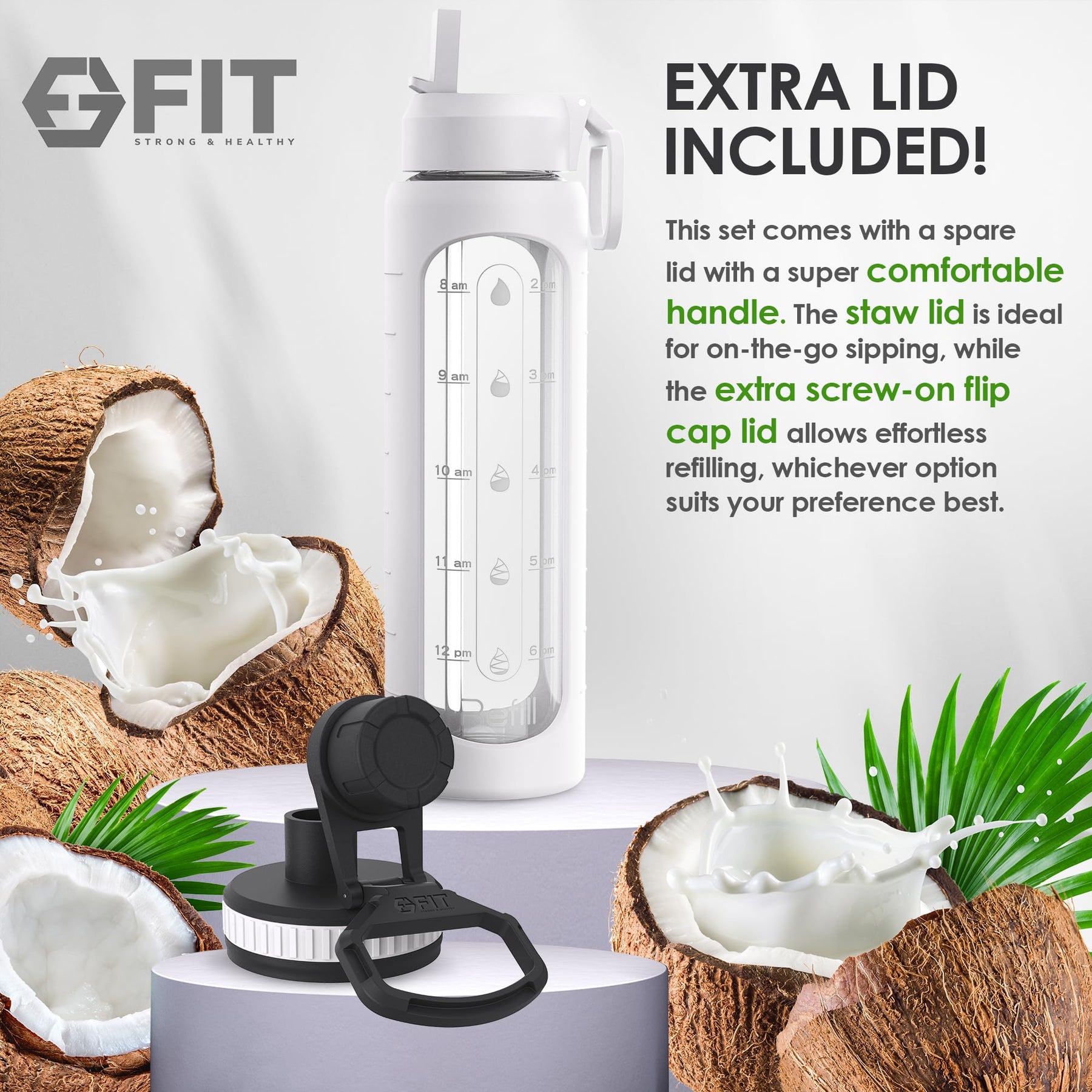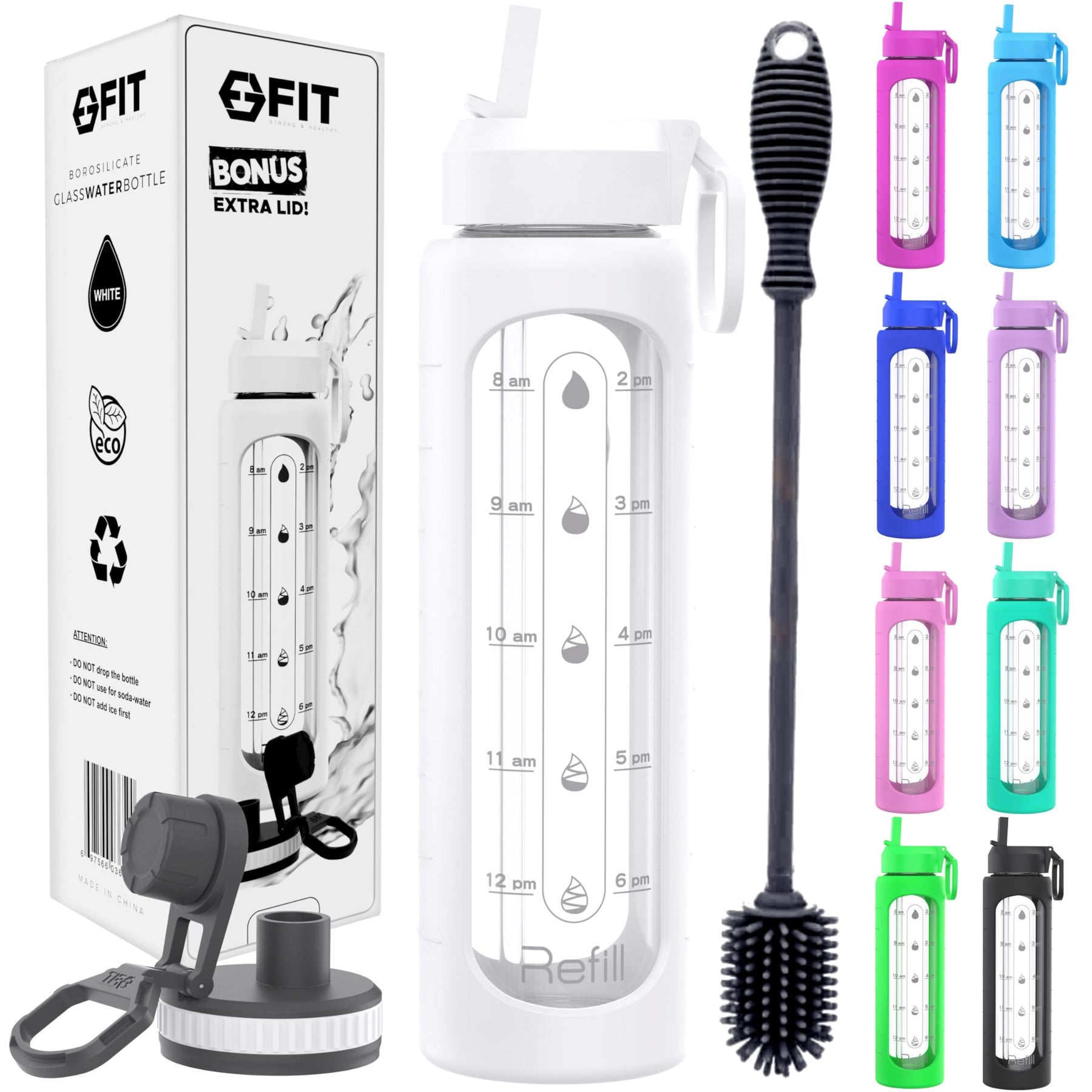 - Original Sports Water Bottles – Glass Water Bottle with Time Marker Reminder 32 oz - EXTRA LID, Reusable, Wide Mouth, Leakproof, 1 Liter Glass Drinking Bottle, Large Motivational Water Bottle, Waterbottle (White, Cleaning Brush) by FIT Strong & Healthy