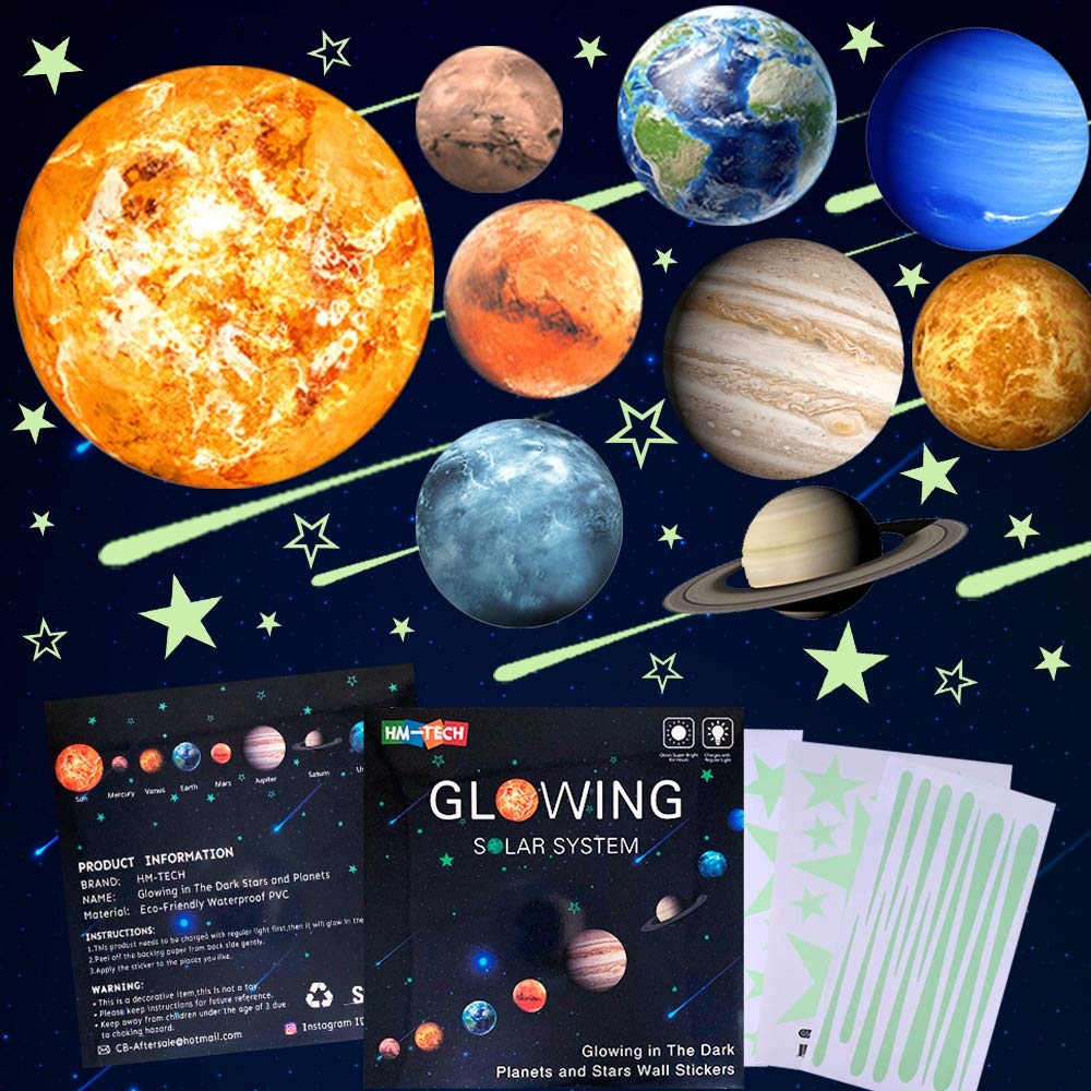 - Original Stickers – Glow in The Dark Stars and Planets, Bright Solar System Wall Stickers -Sun Earth Mars,Stars,Shooting Stars and so on,9 Glowing Ceiling Decals for Bedroom Living Room,Shining Space Decoration for Kids by HM-tech