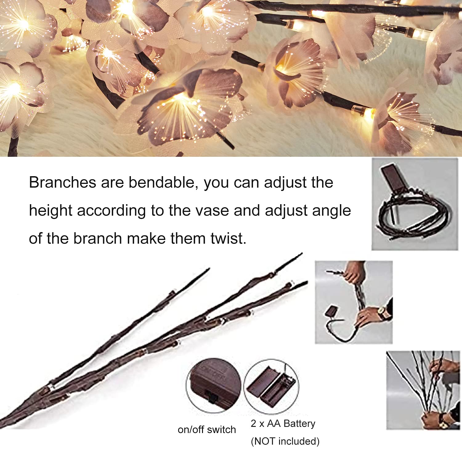 2. Eachlighted decorative flower twig lights comes with 5 bendable stems, decoratedwith 20 Artificial Flowers and 20 LED warm white light. 30 inches total length.Height can be adjusted according to different floor vase..