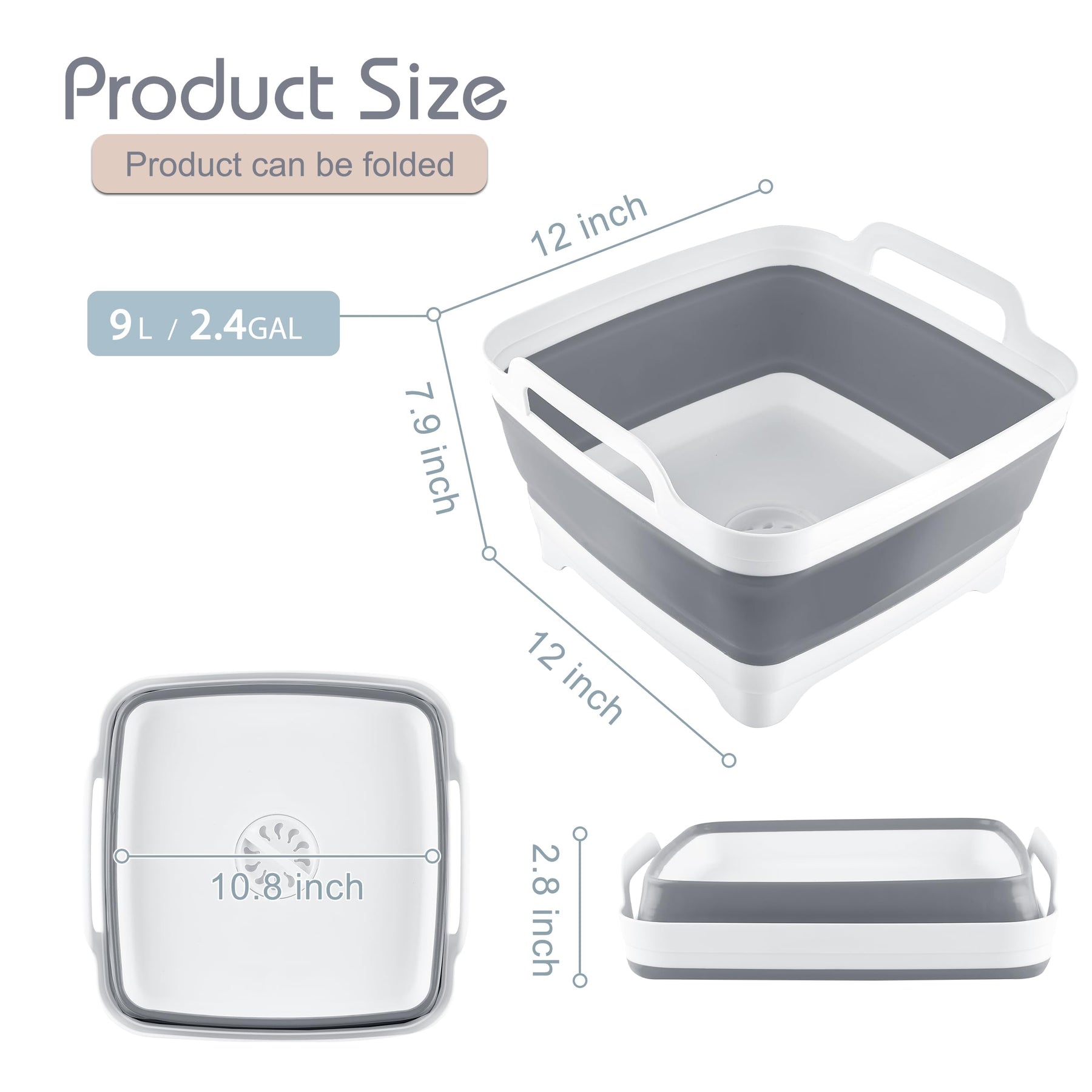 - Space-Saving and FoldableThe dish basin feature a foldable design so that you can adjust the size as needed. It collapses easily for storage and takes up very little space.Expanded size:12.4 x 12 x 7.9(h) inches.Collapsed:2.8 inches. The Interior bottom dimension is about 10.1 x 10.1 inches. Capacity: 9L / 2.4 gallon.