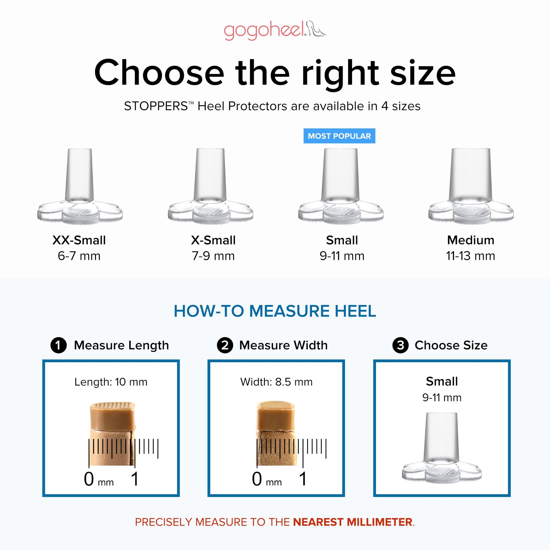 - AVAILABLE IN 4 SIZES: For heel widths 6-13 mm. See Photos for Sizing Chart. Important to measure heel carefully. Made in USA & PATENTED.