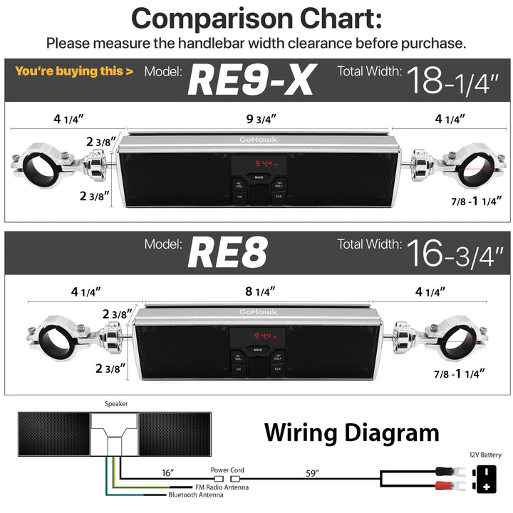 - Original Speaker Systems – RE8 White Gen.3 Waterproof Bluetooth Motorcycle Stereo Speakers LED Soundbar 7/8-1.25 in. Handlebar Mount MP3 Music Player Audio Amplifier System ATV 4 Wheelers USB AUX FM Radio by GoHawk
