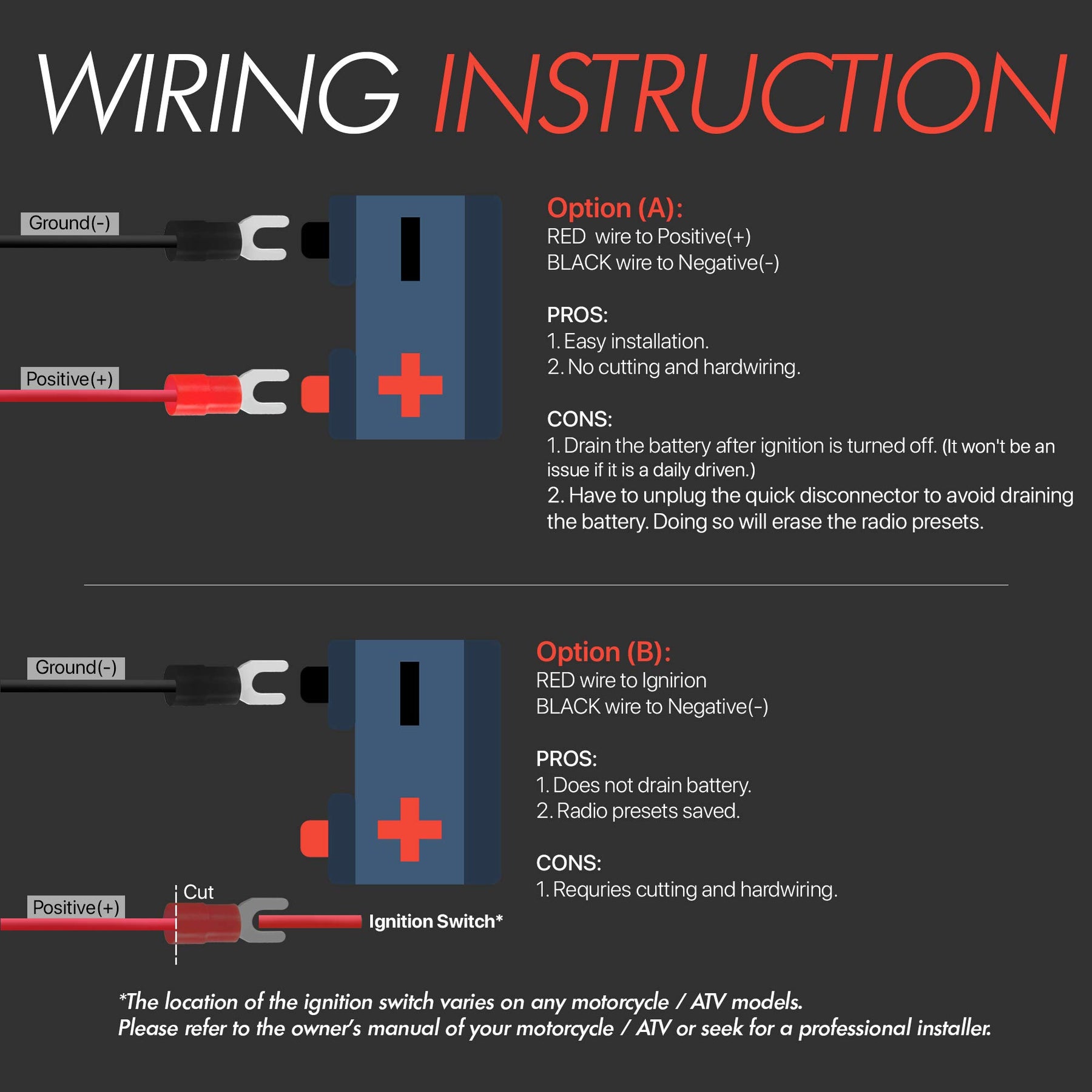 - Superb Crystal Sound Quality. Advanced Waterproof Design. Digital Display. Satin Finished Stereo Unit Built with High Quality Aluminum Material. Perfect for 12V Applications including Motorcycles ATVs 4 Wheelers. Great for outdoor use. Easy Installation: Comes with all necessary hardware and wiring. Plug and Play. Standard 12V Power Connection.