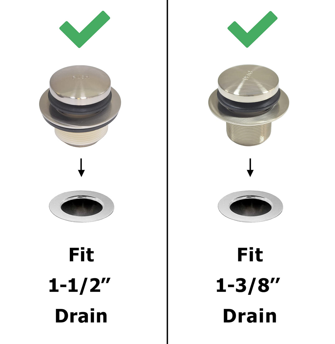 - Universal Fit -No matter what faucet brand you have, this bath stopper will fit it. The bathtub drain fits both 1-1/2 Inch or 1-3/8 Inch drain.