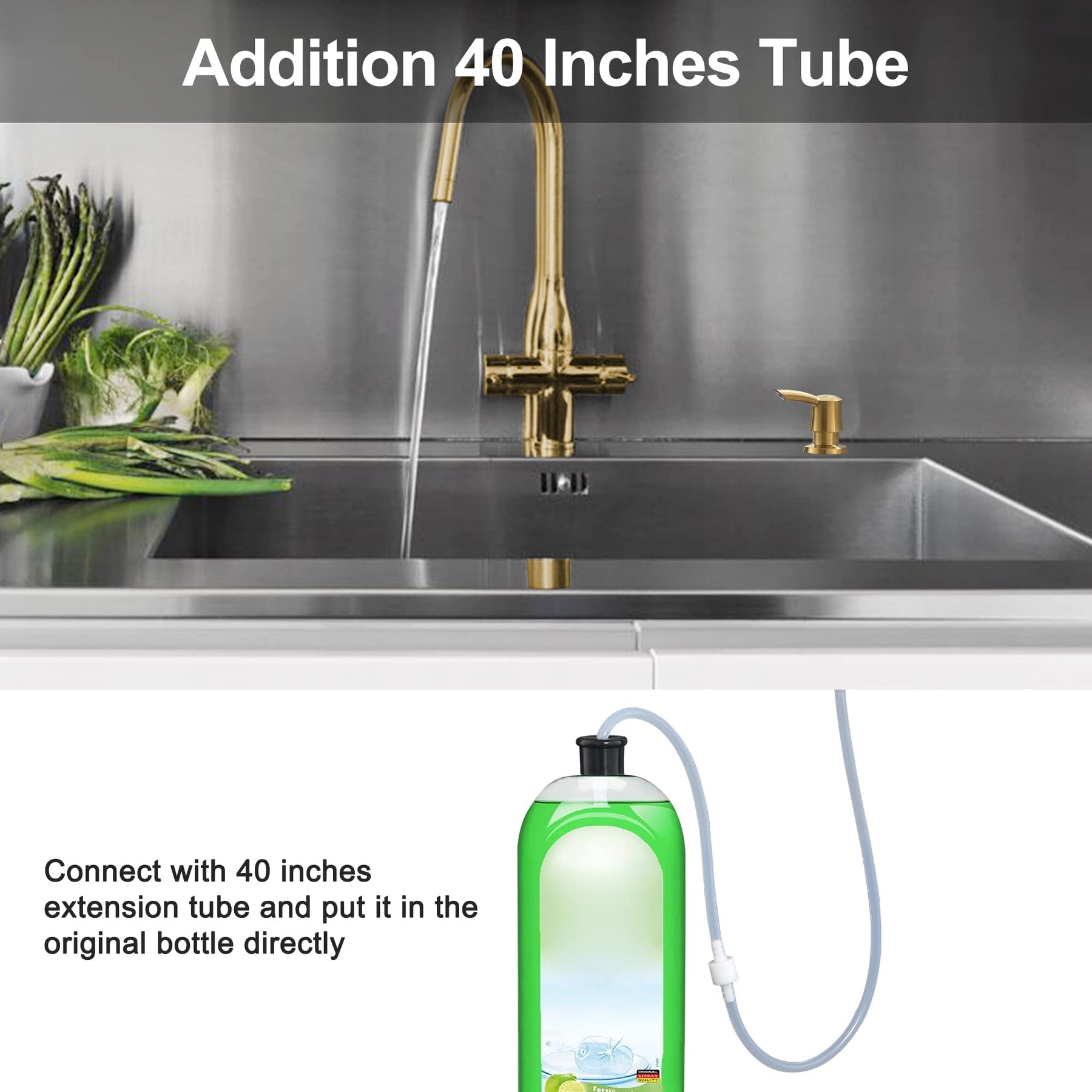 - EXTENSION TUBE KIT: Our gold soap dispenser for kitchen sink with 40 long tube kit for direct insertion into large soap bottles without the need to fill small cans and add soap frequently. Equipped with a highly flexible silicone cap for 0.85-1.2 bottle spout to prevent accidental spillage of soap.