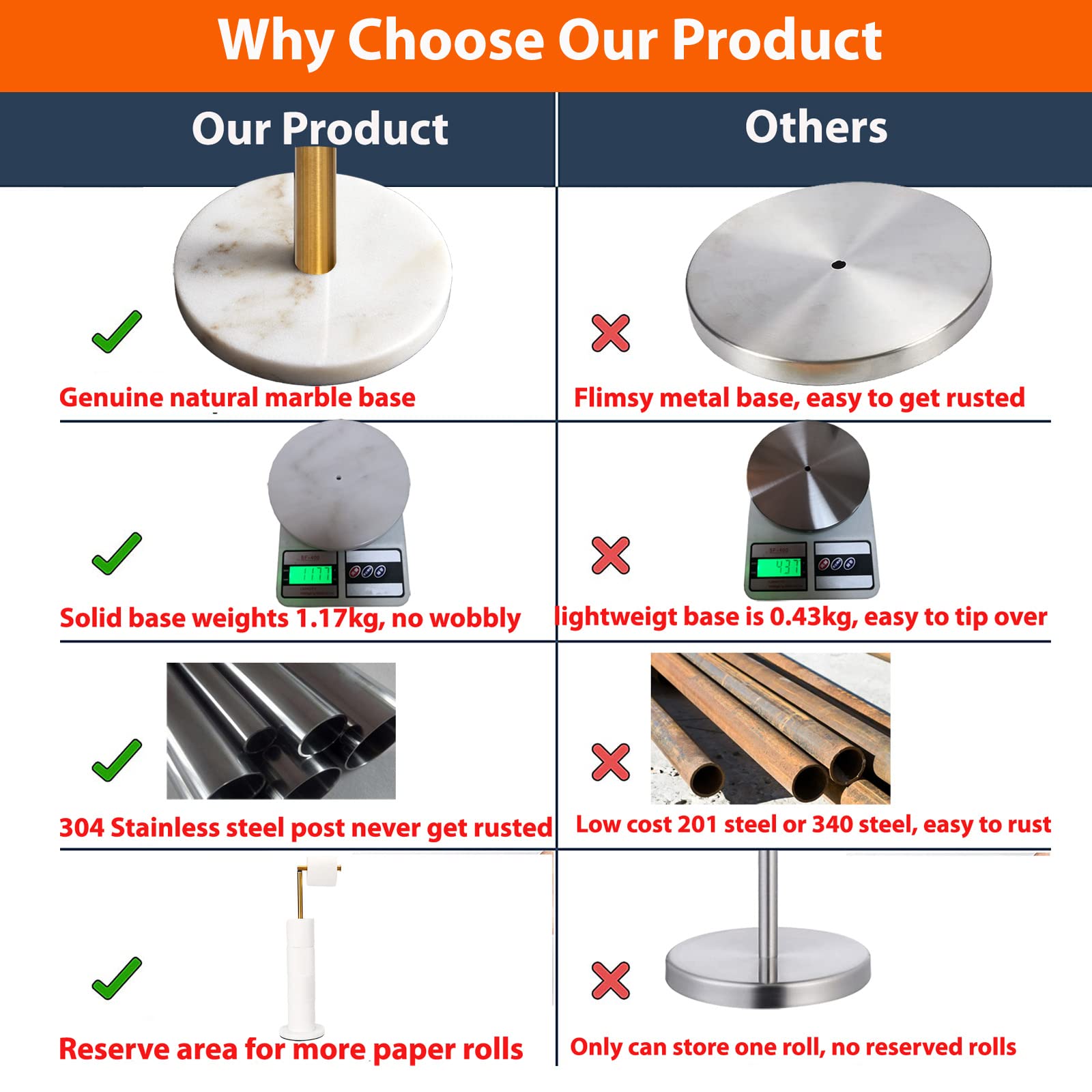 - Sturdy Heavy Marble Base - Natural marble base looks very attractive and modern. The heavy-weighted base can keep the toilet paper holder stand very stable when ripping paper off in one hand. The toilet paper holder will not tip over with this weighted base.