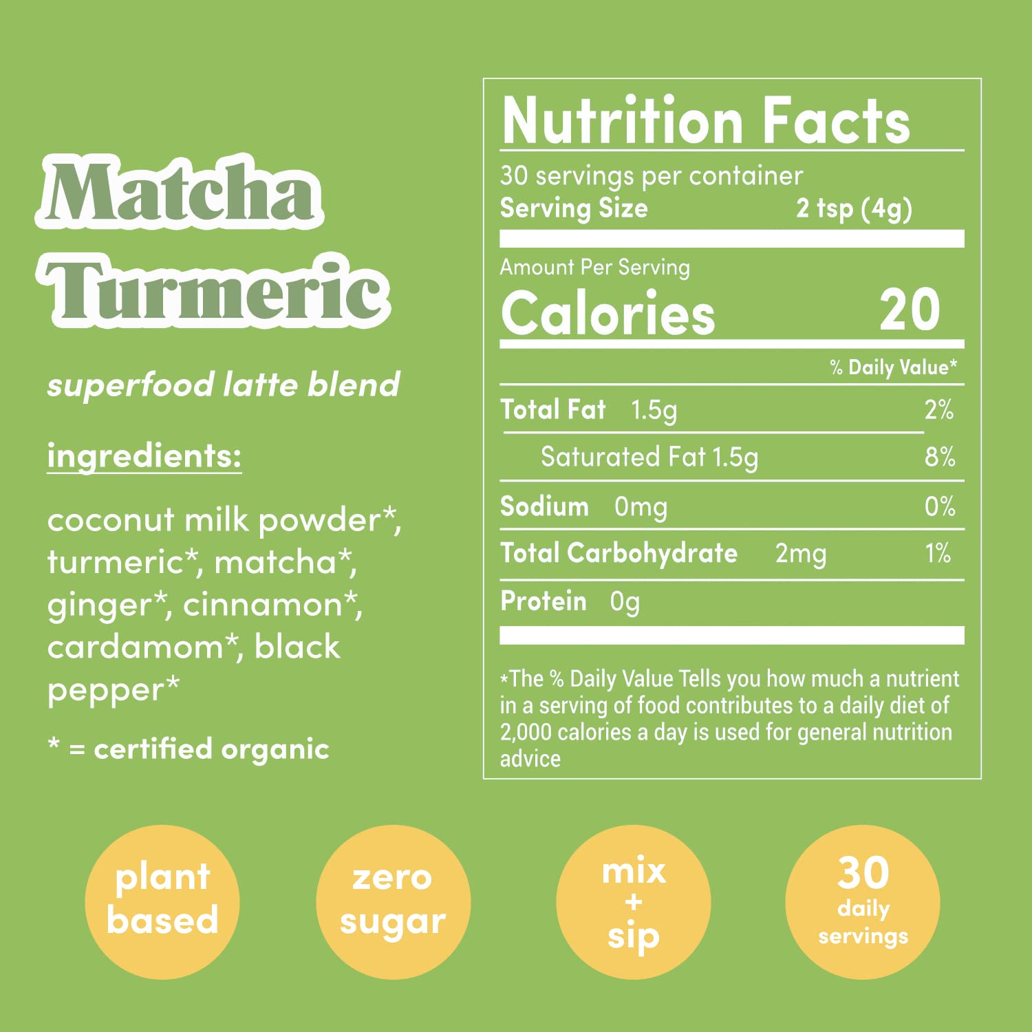| special ingredients | Coconut milk powder (coconut milk, tapioca starch, acacia gum), Turmeric, Matcha green tea, Ginger, Cinnamon, Cardamom, Black pepper |