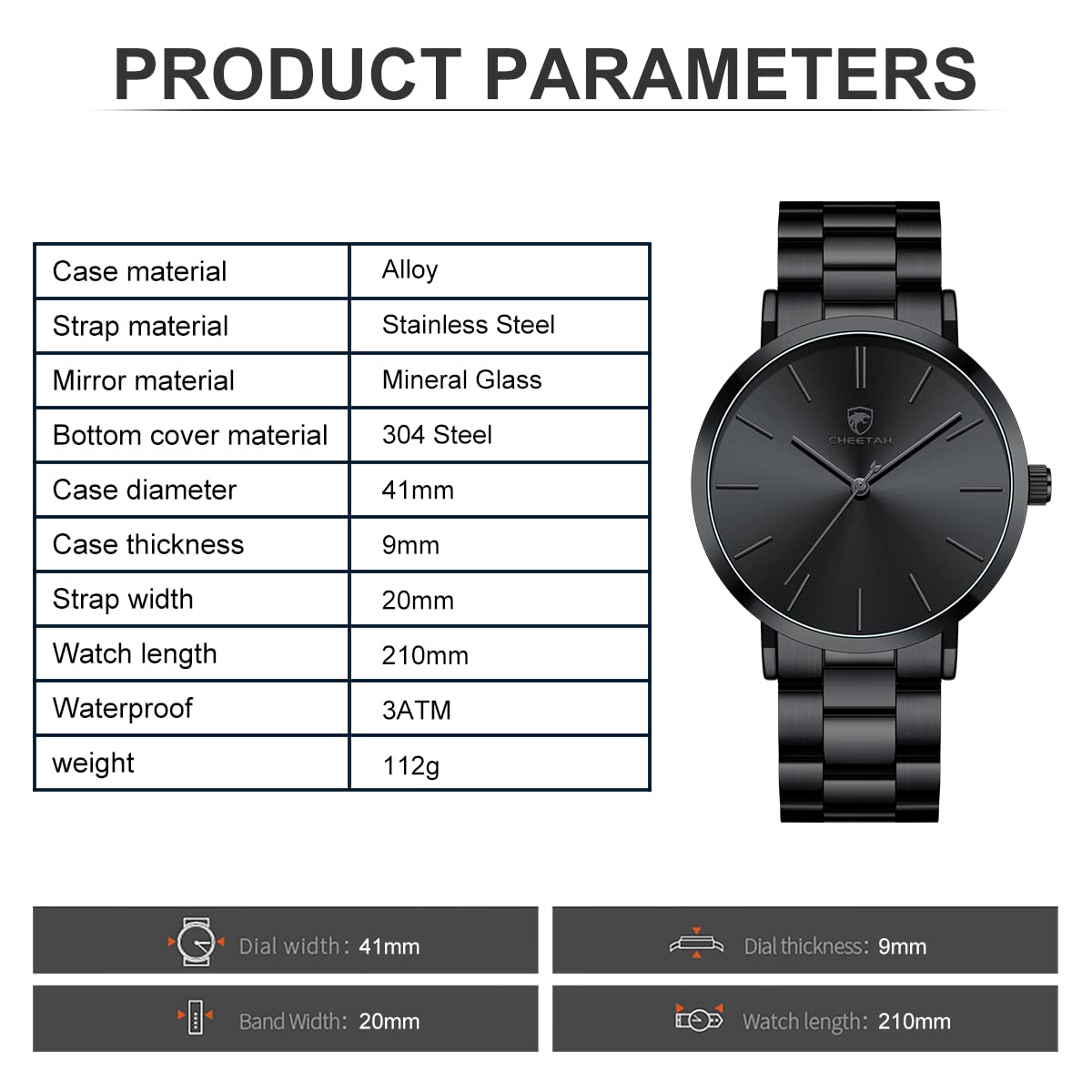 - Simple Sleek Design: thin 8.5 mm thickness dial with rounded all black watch case, minimalist style appearance, unique and eye-catching. Great gifts for Father Day and Christmas.