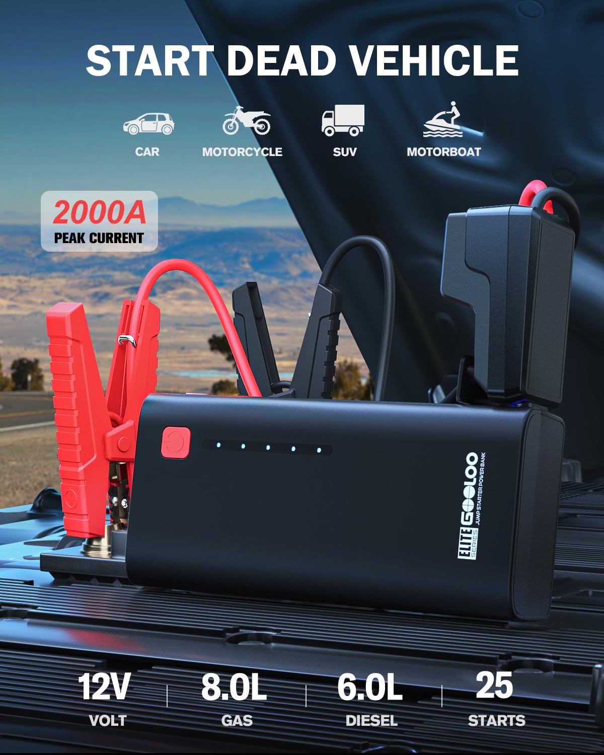 - Original Jump Starters – Jump Starter GE1200 2000A Peak Portable Jump Starter Battery Pack for Up to 8.0L Gas or 6.0L Diesel Engine with USB Quick Charge and LED Light, SuperSafe 12V Lithium Car Starter by GOOLOO