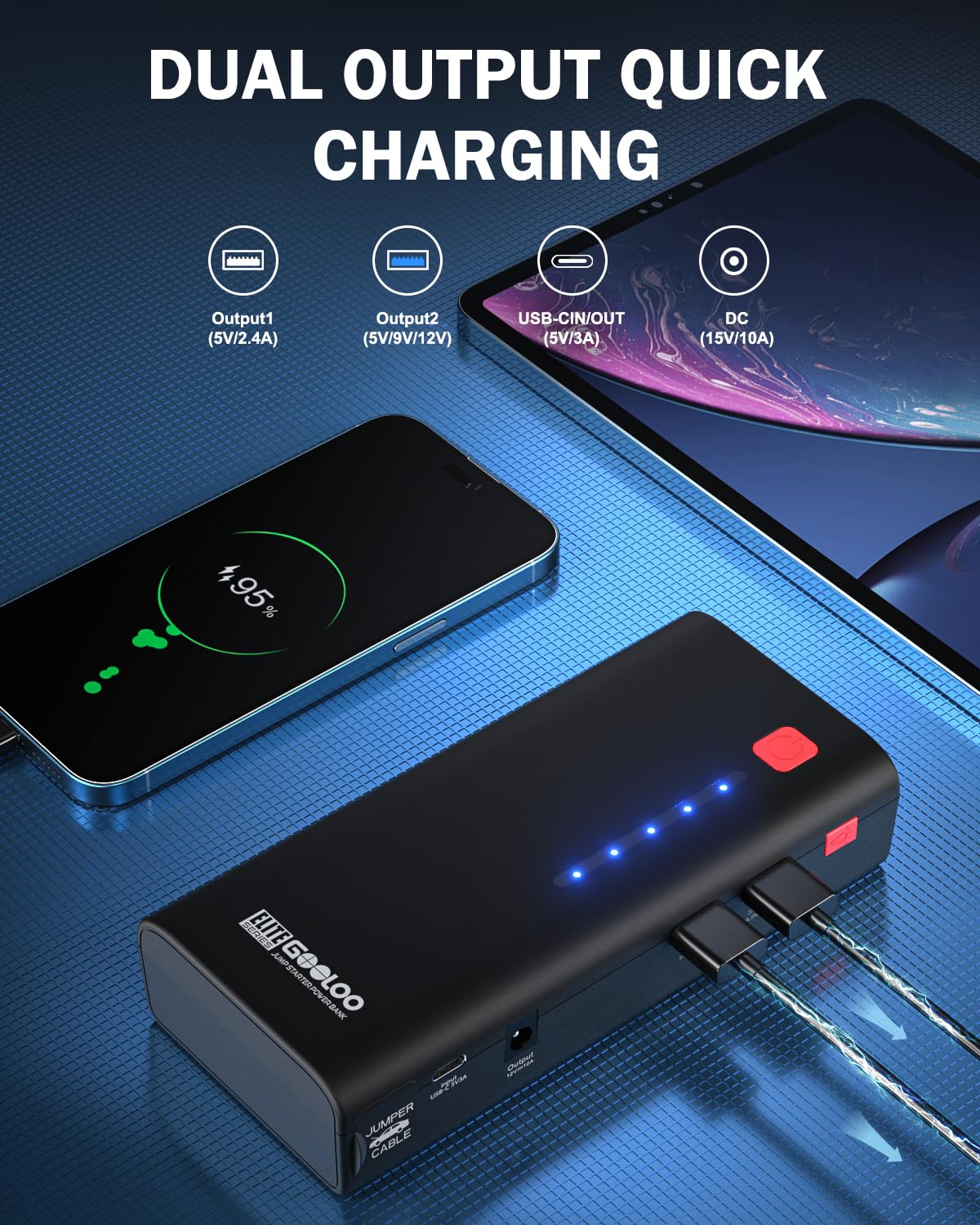- QUICK-CHARGING POWER BANK: The compact jump starter battery pack can charge your phone,tablet,GPS, camera through dual USB ports (5V/9V, 5V/2.4A)up to 70% faster (than standard battery pack technology),and power your other car accessories(tire inflator, car vacuum cleaner, car refrigerator,etc) using a 15V 10A DC port.