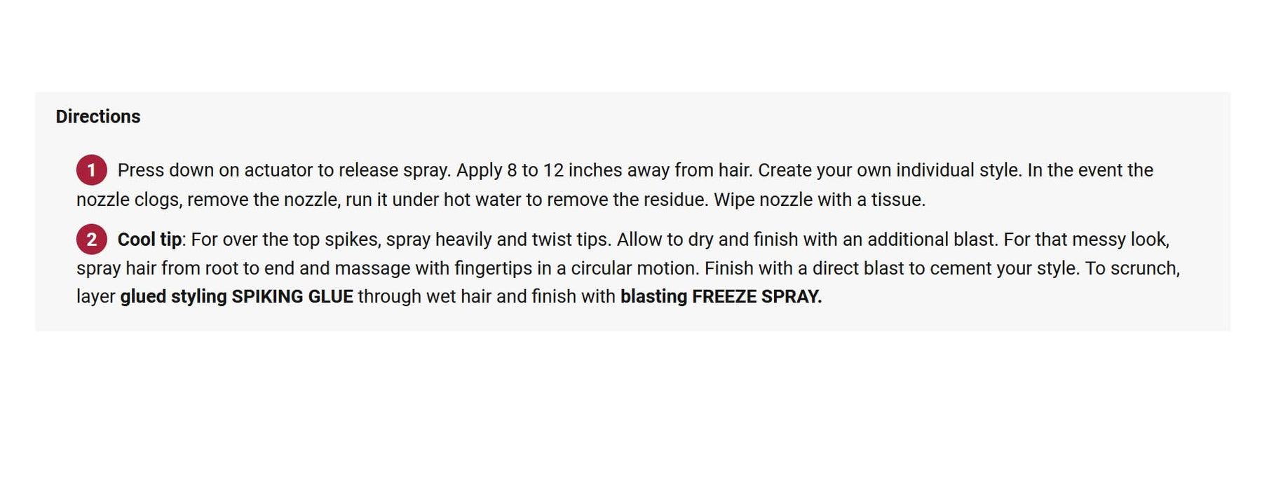 | directions | 1. Shake the can well before using. 2. Hold the can 8-10 inches from dry or damp hair. 3. Spray evenly for blasting hold. 4. If the nozzle clogs, remove and run it under hot water to clear the residue. 5. Wipe nozzle with a tissue. 6. For a messy look, spray through hair carelessly. 7. For spikes, twist tips into place and let dry. |