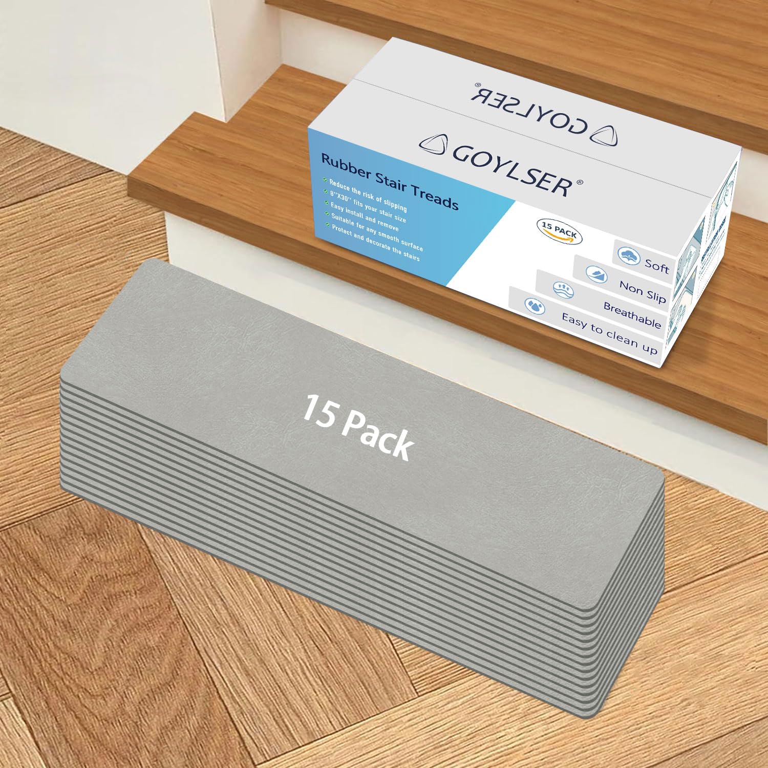- Original Treads – Rubber Stair Treads Pads Non-Slip, 15Pcs Step Mats Stairway Grips Strips Rug, Grey Reusable Staircase Step Carpet Treads Cover for Wooden Stairs by GOYLSER