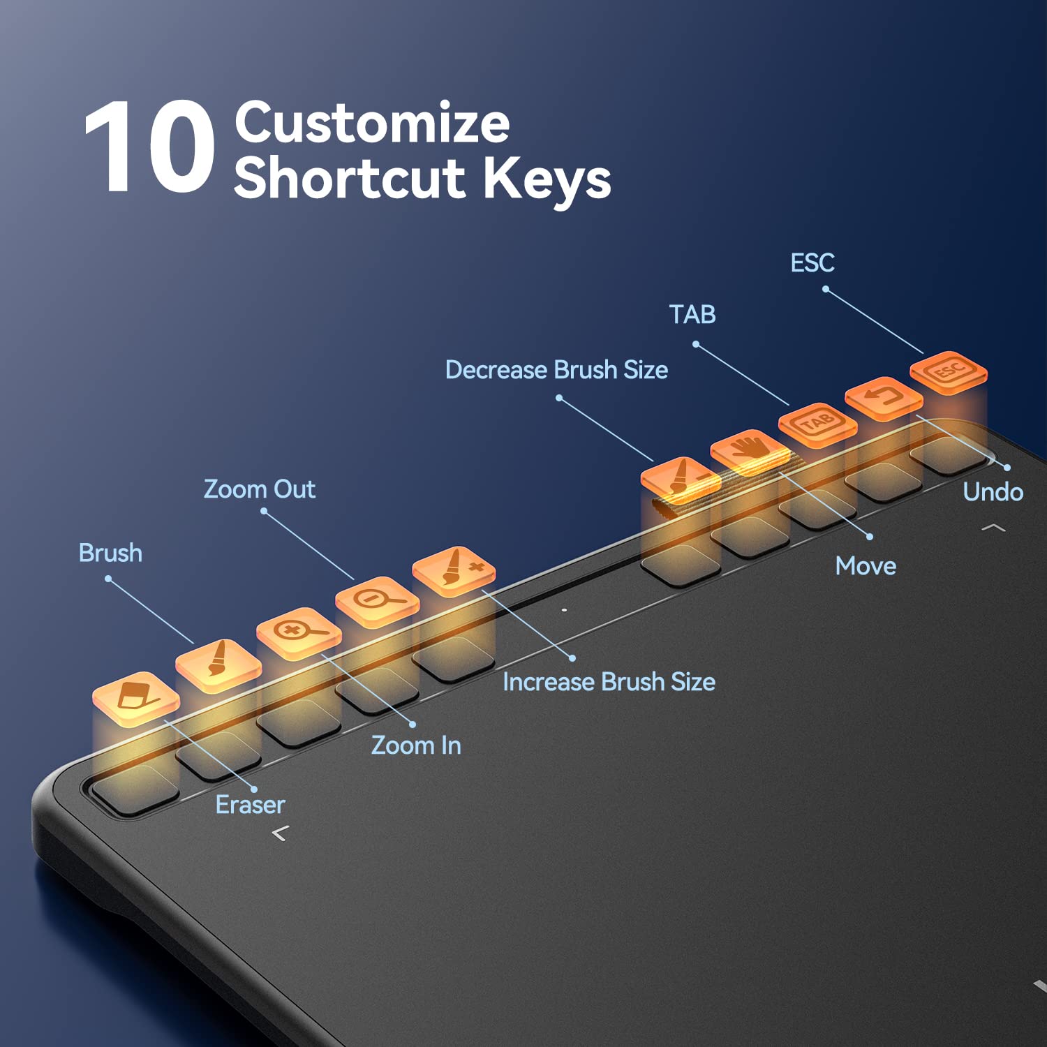 - 10 Customizable HotkeysArt tablet with 10 hot keys for short cuts like eraser, zoom in and out, scrolling and undo, provide a lot more for convenience and helps to improve the productivity and efficiency when creating with the computer graphics tablets