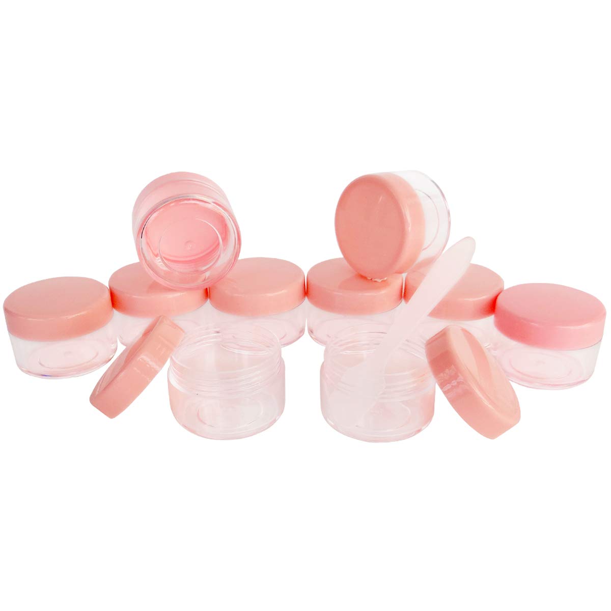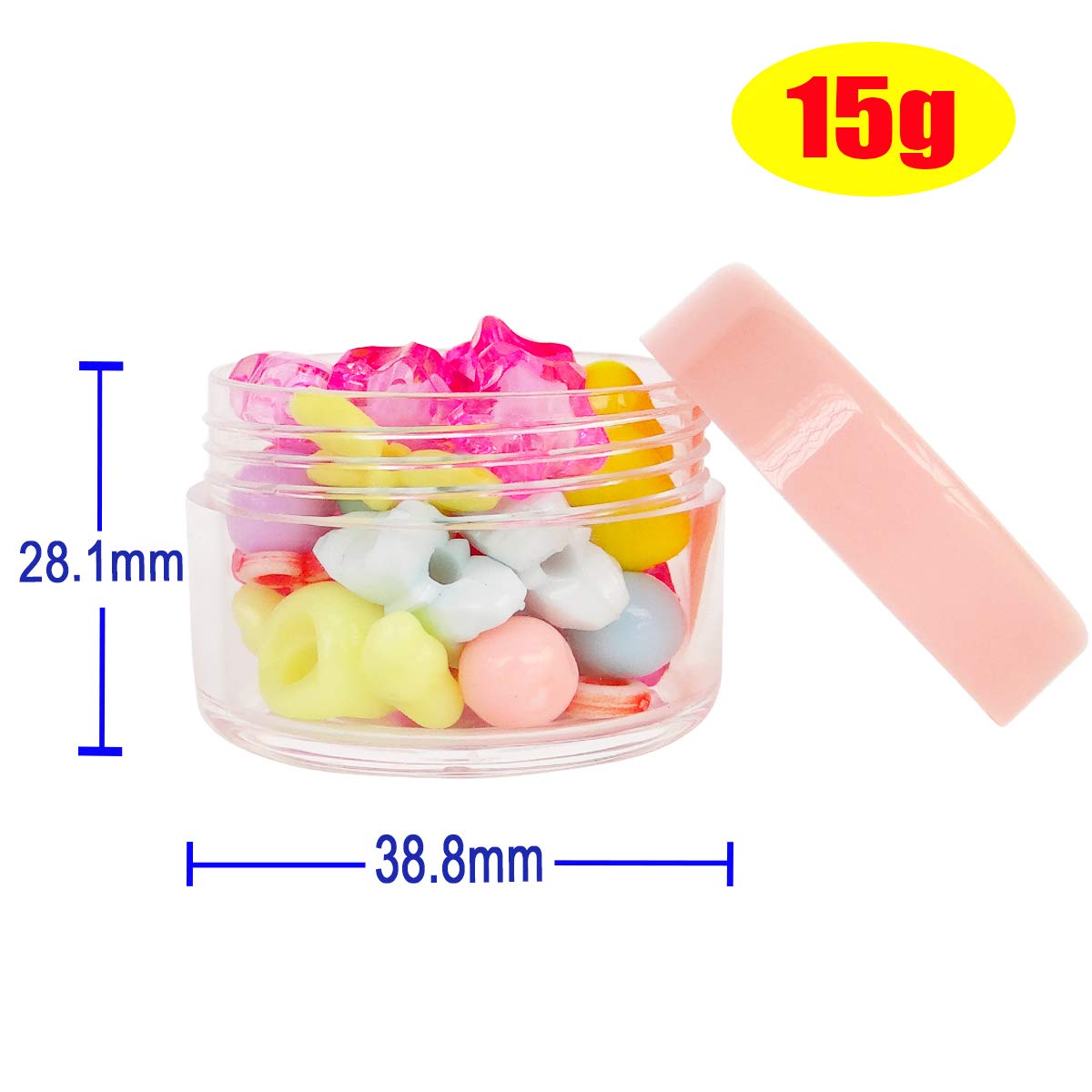 - Greatforu pale pink: 20pcs 15 gram 15ml jars, small cosmetic sample empty container, plastic round pot pink screw cap lid, tiny 15g bottle for makeup, eye shadow, nails, powder, jewelry, beads, free 20 spatulas + labels