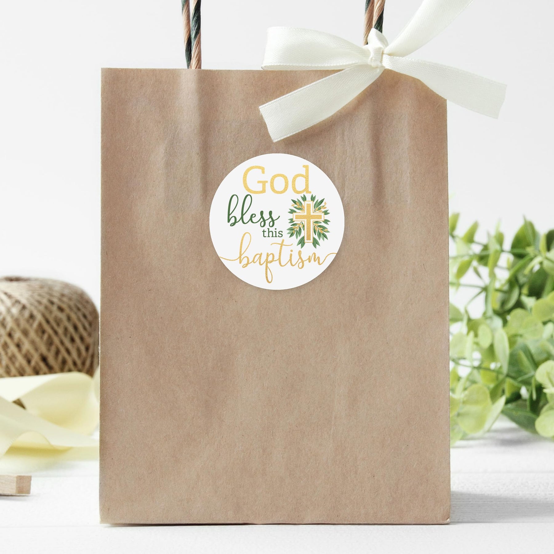 - GOLD IS PRINTED, not foil on these baptism party favor stickers that say God Bless this Baptism. Use as thank you stickers.