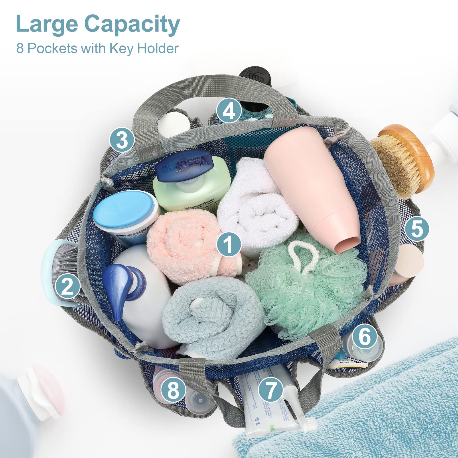 - Large Capacity: mesh shower caddy is a portable and convenient solution for carrying and organizing your shower essentials. The large bathroom caddy tote has 1 main compartment and 7 extra compartments of different sizes, which can hold all of your products, including towels, shampoo, soaps, toothbrushes, comb, toiletries, cosmetics, clothes, and so on
