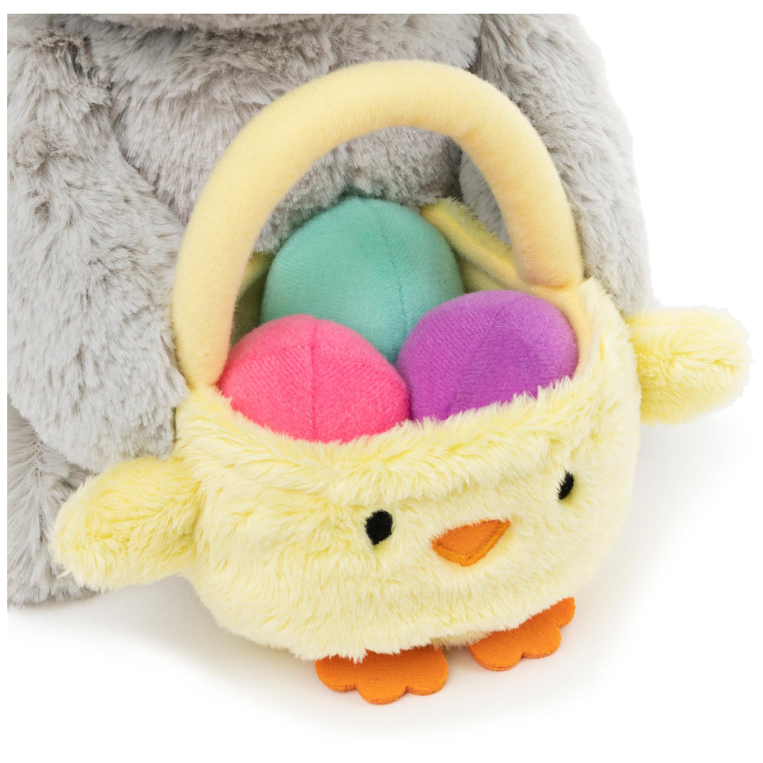 - EASTER BUNNY WITH BASKET: This 10 super-soft plush gray Easter bunny rabbit features pink accented ears, ultra-soft grey plush, and a pastel yellow smiling chick basket with colorful eggs. This plush bunny is the perfect size for any Easter basket!