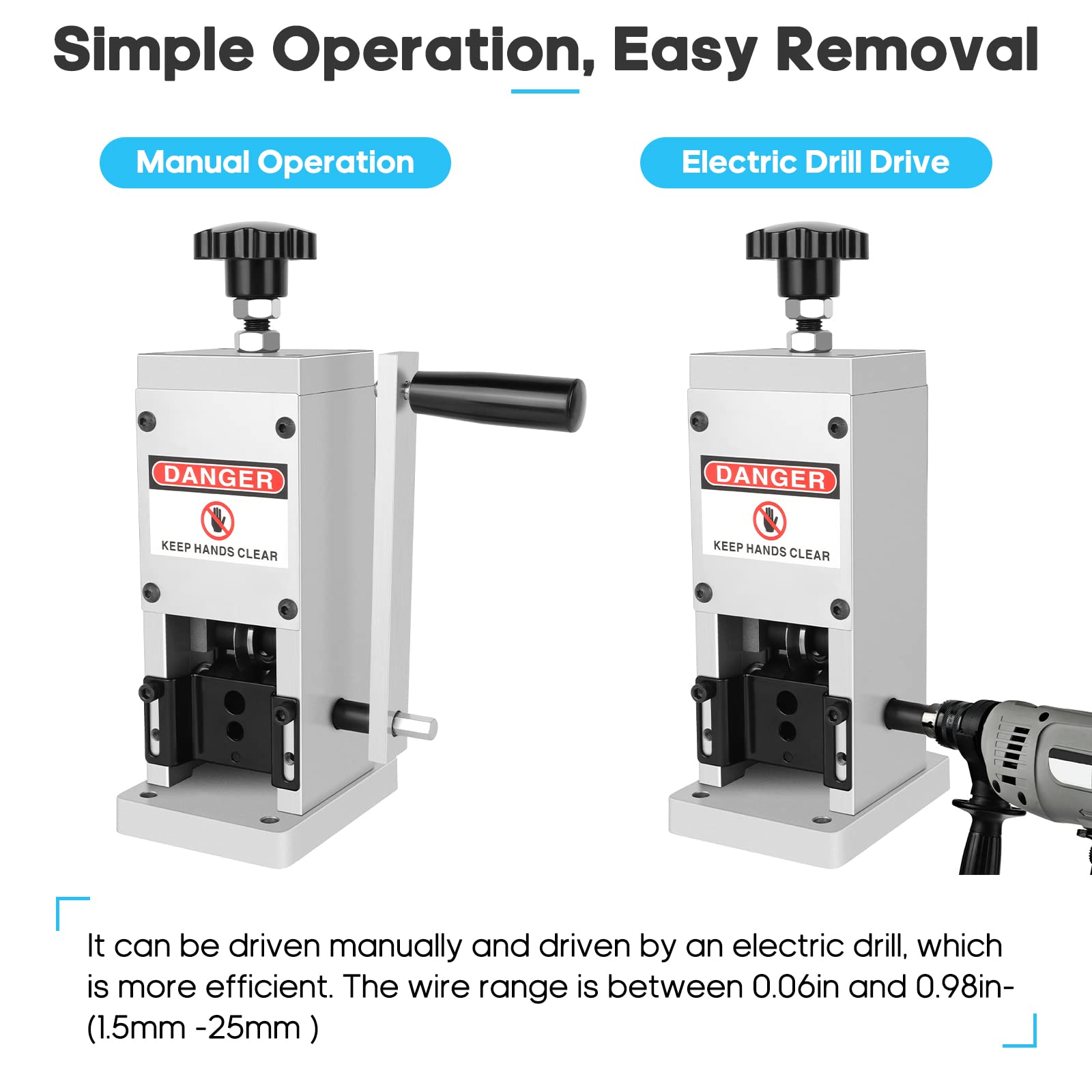 - [Manual and Electric Dual Purpose] - Wire Stripper Machine is manual/electric dual purpose. When it is manually driven, it only needs to install the handle to rotate; when it needs electric drive, it only needs to be driven by a 1/2 drill/motor. Easy to use.