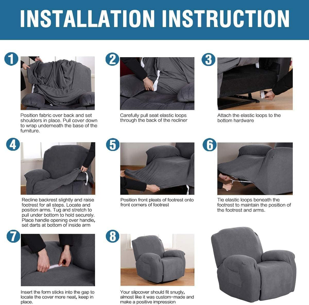 - GREAT FIT: This innovated 1 Piece recliner chair couch cover is crafted from durable and soft high stretch knitted jacquard fabric. Suitable for both manual and electric recliners. Fit back circumference 78 Inches to 88 Inches and sitting width between 24-33 inch. with right side handle, pocket and continuous footrest. The seat has two elastic loops at the back corners to be pulled through to the back of the recliner