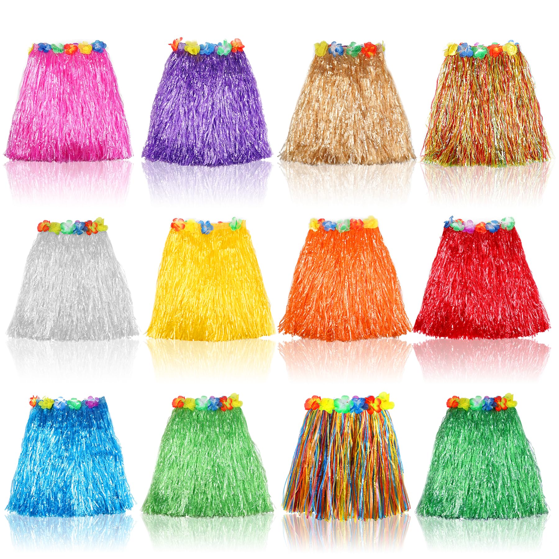 - PACKAGE CONTAINS: Includes 12 elastic Hawaiian luau hula grass skirt sets, matching your various options. Made of high-quality polyester-blend fabric flowers and plastic strips; Each is brand new and individually packaged. Soft and comfortable materials allow for long time wearing. Premium quality can be worn many times. Great outfit for luau or costume party!Beautiful and Durable.