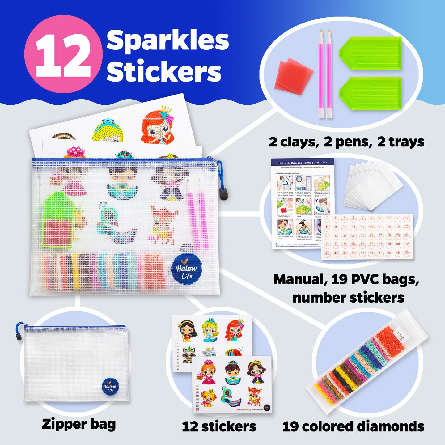 - DAZZLING CRAFT KIT – Create Diamond painting stickers that shine with Halmolife’s diamond painting kits for kids! Your boys and girls crafts let you bedazzle backpacks, mugs, books, and more with princesses and their pets!