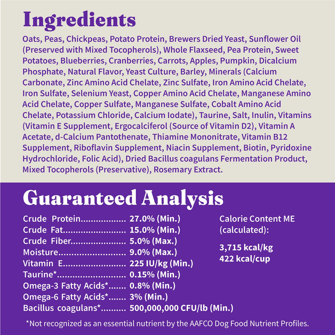 | ingredients | Ground peas, chickpeas, pearled barley, oat groats, pea protein, whole flaxseed, sunflower oil (preserved with mixed tocopherols), dried plain beet pulp, sweet potato, potato, dicalcium phosphate, dried alfalfa meal, natural vegetable flavor, canola oil (preserved with mixed tocopherols), dried kelp, carrots, celery, beets, parsley, lettuce, watercress, spinach, calcium carbonate, salt, dl-methionine, potassium chloride, dried cranberry, dried blueberry, dried apple pomace, taurine, choline chloride, L-carnitine, inulin, vitamins (vitamin B12 supplement, niacin supplement, vitamin A supplement, d-calcium pantothenate, riboflavin supplement, ergocalciferol (source of vitamin D2), thiamine mononitrate, pyridoxine hydrochloride, biotin, folic acid), minerals (zinc proteinate, iron proteinate, zinc sulfate, ferrous sulfate, manganese proteinate, manganese sulfate, cobalt proteinate, copper proteinate, copper sulfate, ethylenediamine dihydroiodide, sodium selenite), mixed tocopherols (preservative). |