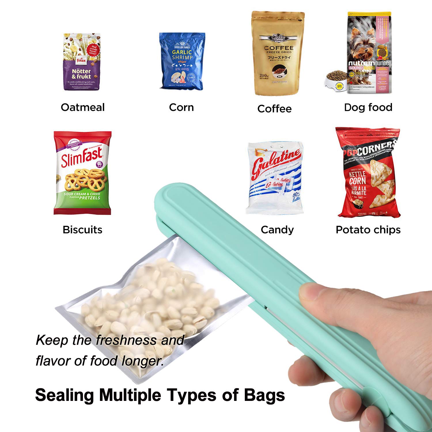 - SEALING MULTIPLE TYPES OF BAGSHeat sealer works for snack bags, pet cat dog foods bags, coated aluminum foil bags, and handmade candy dessert plastic bag package and so on. (Do not use for flimsy plastic bags at the max temperature)