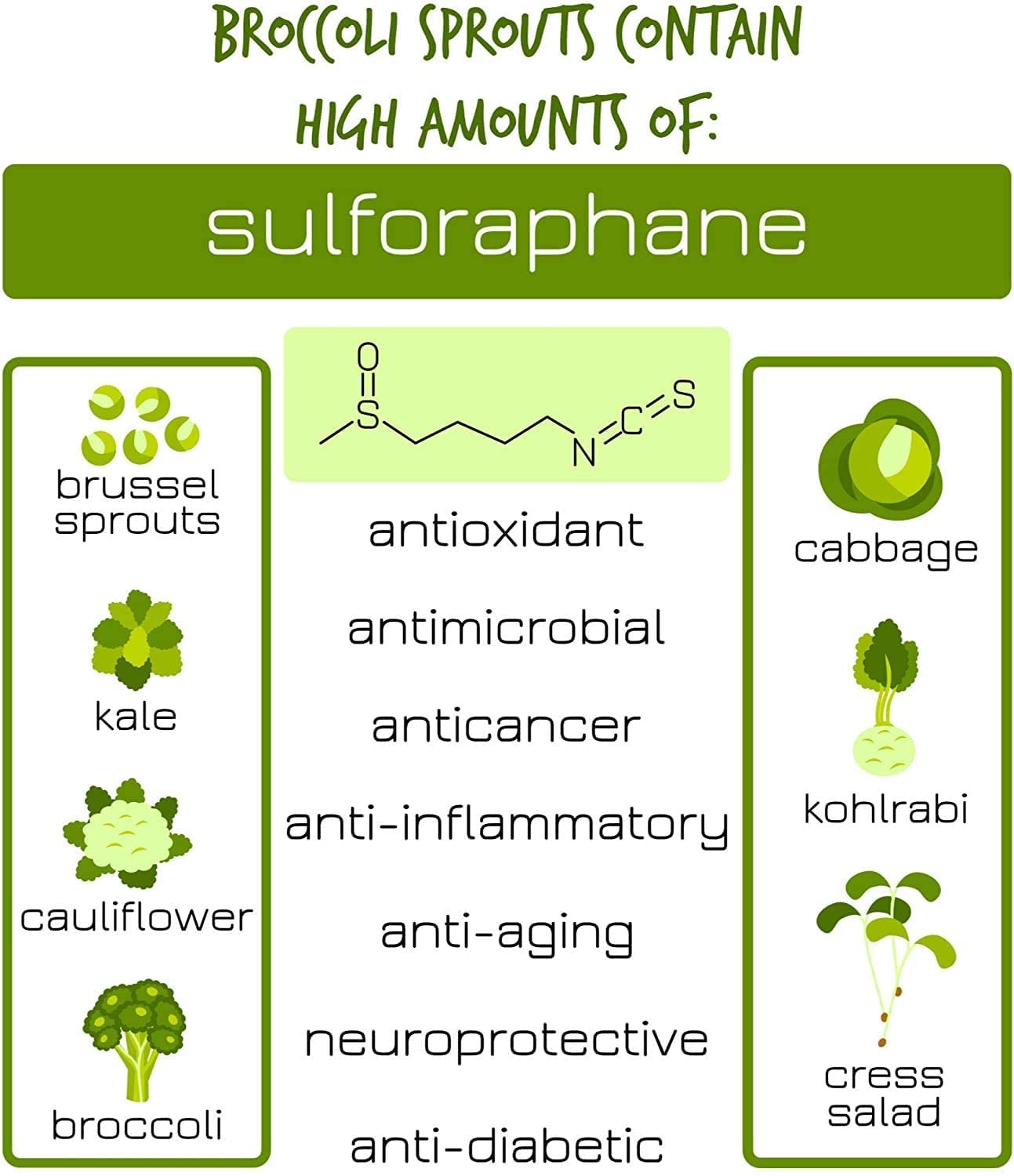 - NUTRIENT DENSE broccoli sprouts are rich in vitamins, mineral, antioxidants, and protein. They have recently become popular after it was discovered they abound with the amazing phytochemical, sulforaphane.