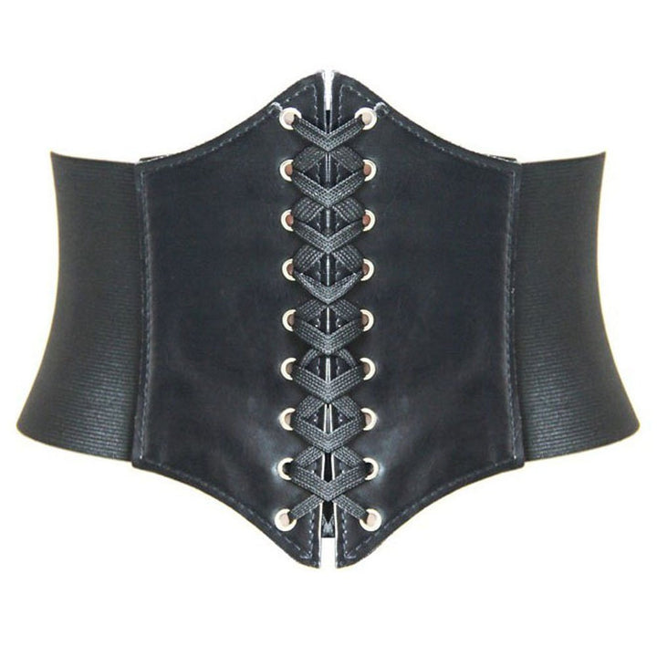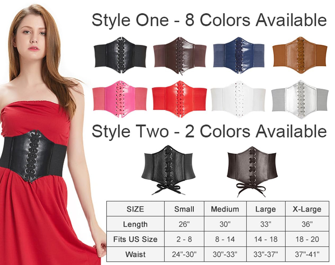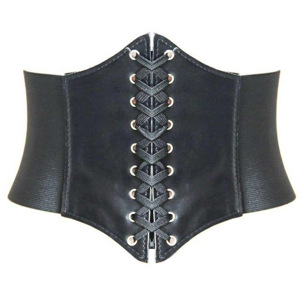 - Vintage Style Dress Belt for Women Classic vintage style leather lace-up tied waspie corset belt, is made of polyester and PU leather. Front: combination of premium faux leather and lace-up design. Back: elastic elastic band with 2 nylon bands for easy on and off, pressed and bonded together ( sticky tape closure ).